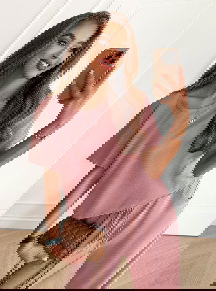 Komplet bluzka z krótkim rękawem i szerokie spodnie Rumie - brudny róż to stylizacja, która łączy w sobie wygodę i elegancję. Jego delikatny odcień sprawia, że wygląda niezwykle kobieco i subtelnie. Prosty krój zestawu daje mnóstwo możliwości stylizacji, od casualowych po bardziej eleganckie. To idealna baza, którą można dowolnie uzupełniać dodatkami. Dzięki szerokim spodniom i luźnej bluzce całość prezentuje się lekko i z klasą. To świetny wybór na wiele różnych okazji – zarówno codziennych, jak i wyjątkowych. Ten komplet to połączenie prostoty i ponadczasowej elegancji, które zawsze się sprawdzi.
