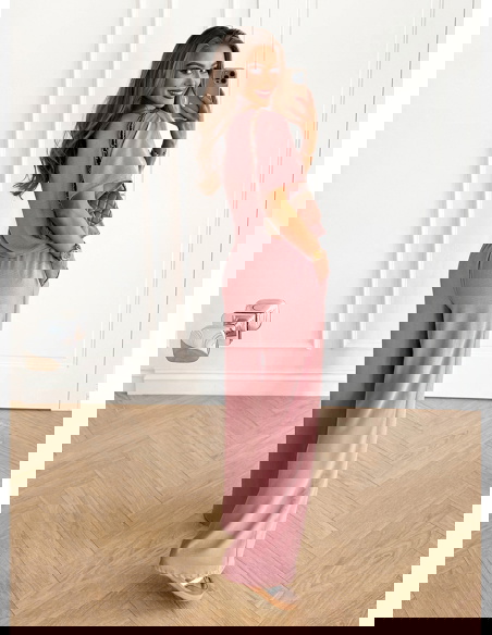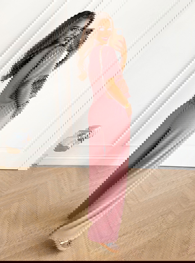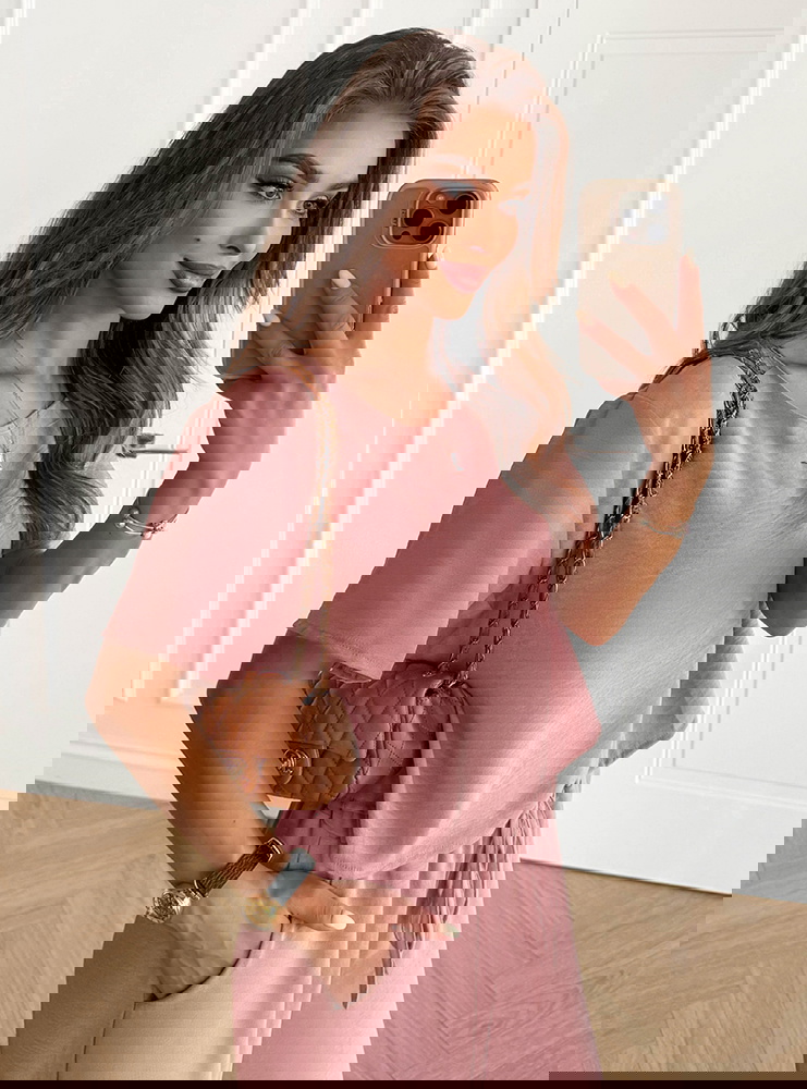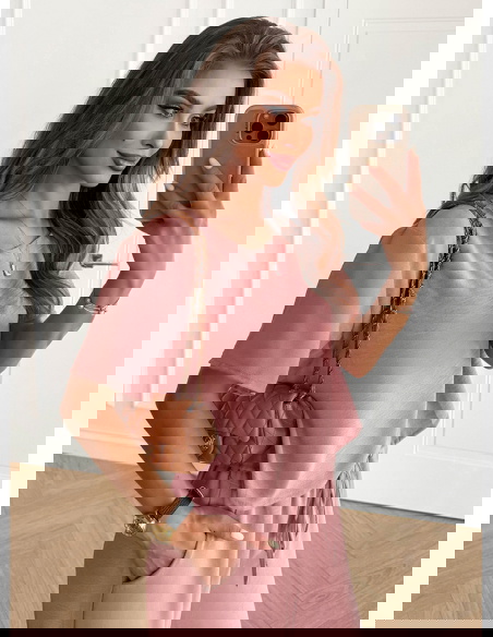 Komplet bluzka z krótkim rękawem i szerokie spodnie Rumie - brudny róż to stylizacja, która od razu przyciąga uwagę swoją subtelnością i elegancją. Ten wyjątkowy odcień różu dodaje delikatności, a jednocześnie sprawia, że całość prezentuje się nowocześnie i z klasą. To połączenie prostoty i wygody, które idealnie sprawdzi się w codziennych stylizacjach. Luźny krój bluzki zapewnia swobodę ruchów, a szerokie spodnie nadają sylwetce lekkości i szyku. Dzięki wiązaniu w pasie spodnie można idealnie dopasować, co dodatkowo podkreśla atuty figury. Komplet ten pozwala stworzyć kobiecy look bez zbędnego wysiłku – wystarczy kilka dodatków, aby całość nabrała charakteru. Brudny róż to kolor niezwykle uniwersalny, pasujący zarówno do jasnych, jak i ciemniejszych akcentów. Stylizacja ta świetnie wpisuje się w aktualne trendy, łącząc minimalizm z elegancją. Zestawienie bluzki i spodni tworzy harmonijną całość, która sprawdzi się w wielu sytuacjach. To idealna propozycja dla kobiet, które lubią wyglądać stylowo i czuć się swobodnie każdego dnia.