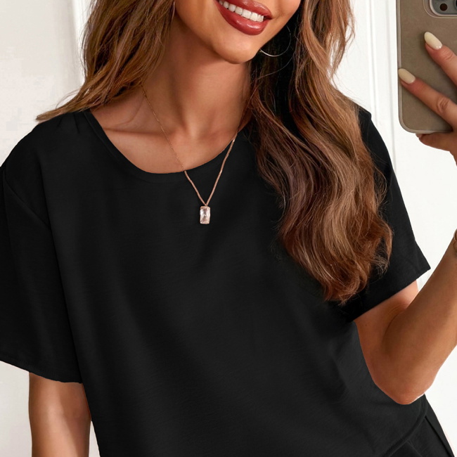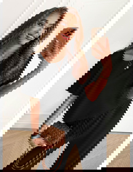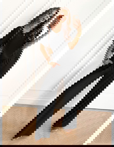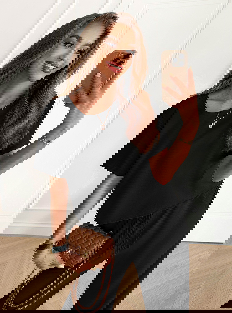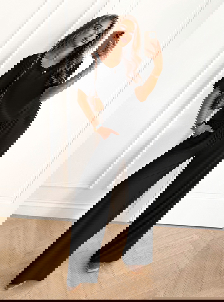 Czarny komplet bluzka z krótkim rękawem i szerokie spodnie Rumie