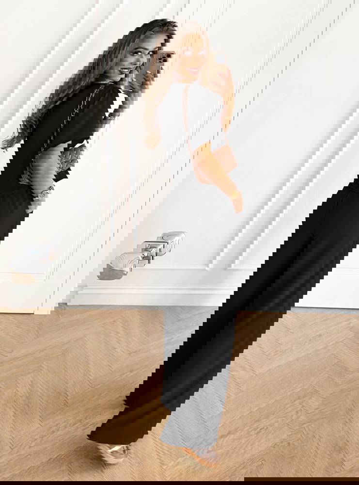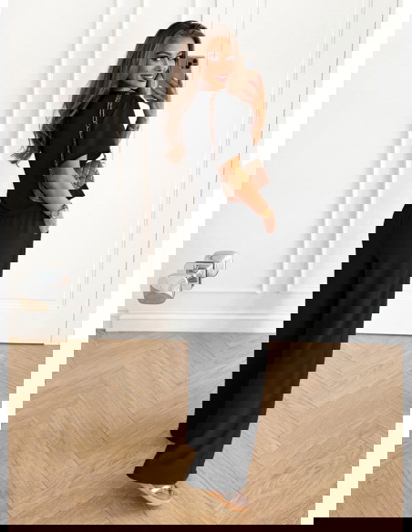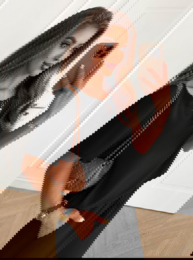 Czarny komplet bluzka z krótkim rękawem i szerokie spodnie Rumie to propozycja, która emanuje elegancją i ponadczasowym stylem. Czerń od zawsze uznawana jest za kolor klasy i szyku, dlatego taki zestaw nigdy nie wychodzi z mody. Minimalistyczna forma sprawia, że komplet jest niezwykle uniwersalny i łatwy do wystylizowania. Luźna bluzka w połączeniu z szerokimi spodniami tworzy harmonijną całość, która podkreśla sylwetkę, zachowując przy tym komfort noszenia. Dzięki wiązaniu w pasie spodnie można idealnie dopasować, co dodaje im praktyczności. Taki zestaw świetnie sprawdzi się zarówno na co dzień, jak i na bardziej wyjątkowe okazje. Czerń nadaje stylizacji charakteru, sprawiając, że prezentuje się elegancko bez względu na dodatki. Możesz nosić go w prostym wydaniu lub podkreślić całość wyrazistą biżuterią i torebką. To komplet, który bez wysiłku wprowadzi do garderoby nutę klasy i modowego wyrafinowania. Doskonale łączy w sobie prostotę, elegancję i wygodę, co czyni go niezastąpionym elementem każdej szafy.