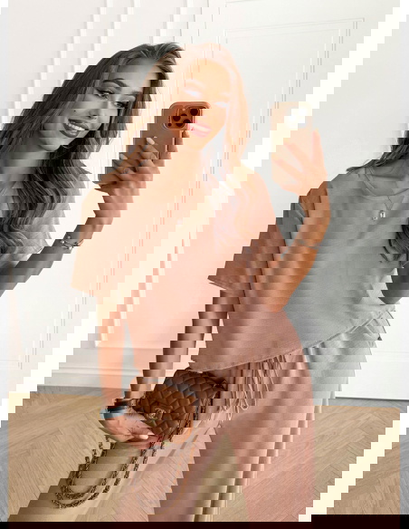 Komplet bluzka z krótkim rękawem i szerokie spodnie Rumie - mocha mousse
