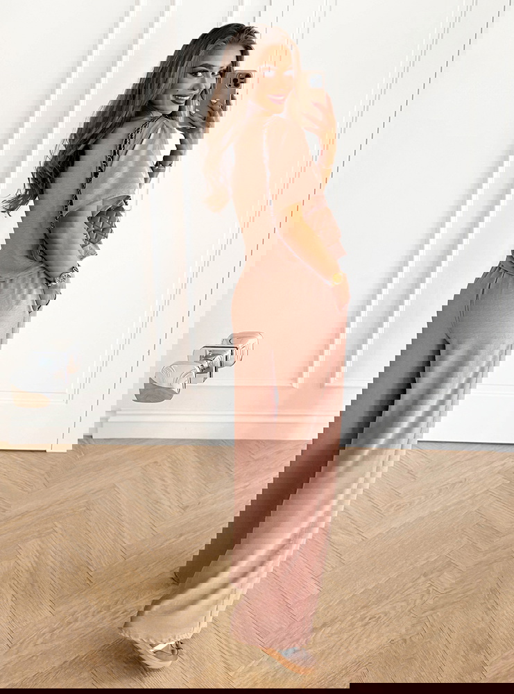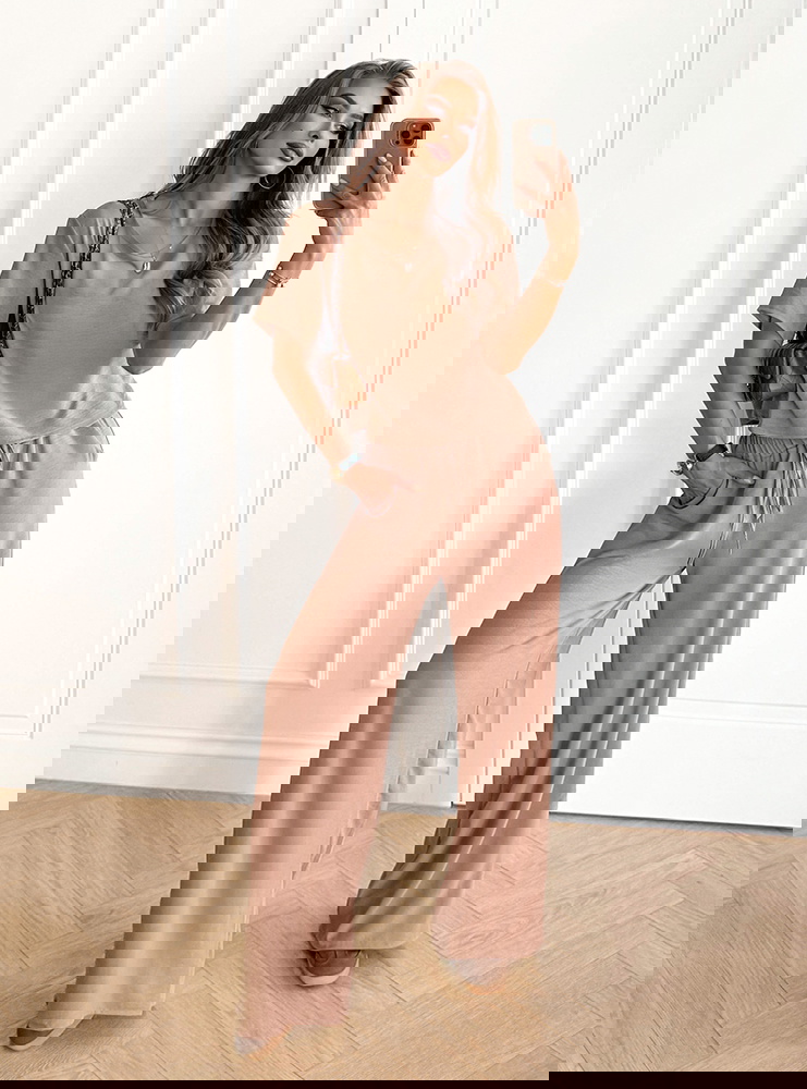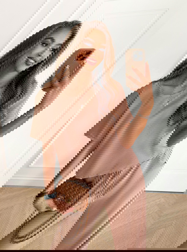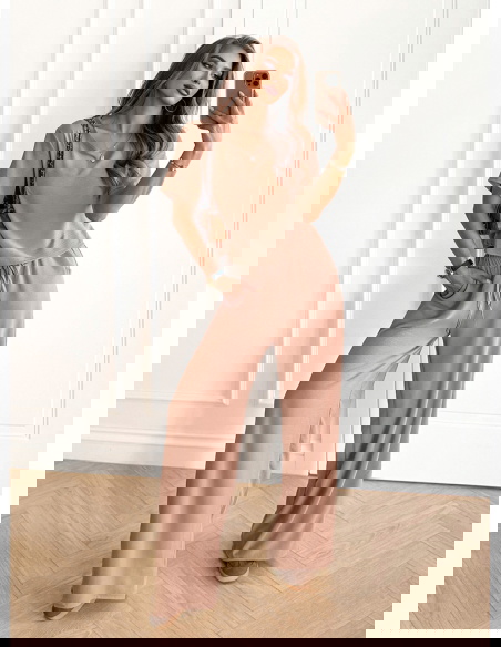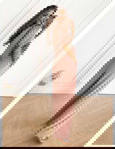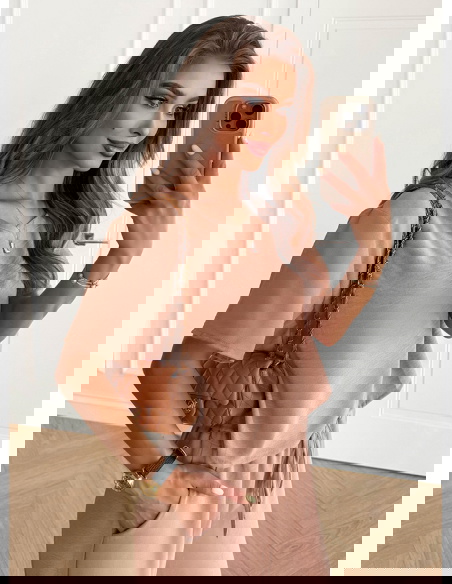 Komplet bluzka z krótkim rękawem i szerokie spodnie Rumie - mocha mousse to stylizacja, która zachwyca swoim subtelnym kolorem i ponadczasowym krojem. Odcień mocha mousse to ciepła, delikatna barwa, która pięknie podkreśla kobiecość i pasuje do wielu typów urody. Ten komplet to doskonały wybór, jeśli lubisz połączenie wygody i elegancji w codziennym wydaniu. Luźna bluzka zapewnia swobodę ruchów i świetnie komponuje się ze spodniami o szerokich nogawkach. Spodnie z wiązaniem w pasie można dopasować według własnych preferencji, co sprawia, że całość prezentuje się idealnie. Taki zestaw wygląda modnie, a jednocześnie jest bardzo komfortowy w noszeniu. To opcja, która łączy w sobie minimalizm i szyk, sprawiając, że nie potrzebujesz wielu dodatków, by prezentować się stylowo. Kolor mocha mousse dodaje elegancji i lekkości, sprawiając, że całość wpisuje się w aktualne trendy. To komplet, który będzie idealną bazą do tworzenia wielu różnorodnych stylizacji. Niezależnie od okazji, zawsze zapewni świeży i modny wygląd.