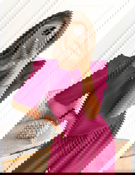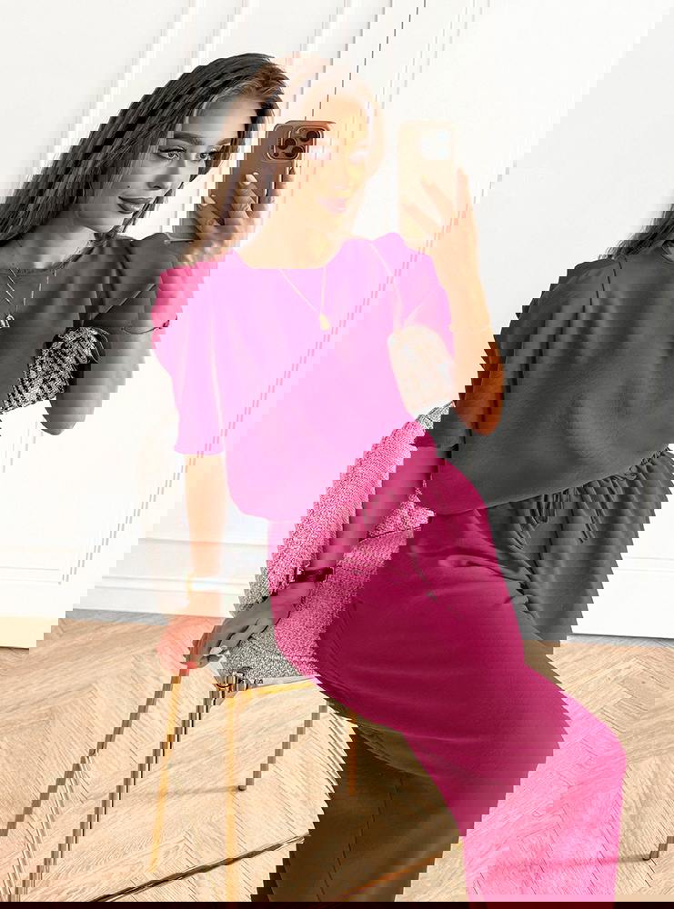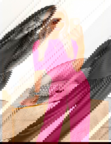 Komplet bluzka i szerokie spodnie z wiązaniem Annya - fuksja to modna i kobieca propozycja, która łączy wygodę i styl. Jego soczysty kolor dodaje energii i sprawia, że każda stylizacja nabiera świeżości. Krój podkreśla sylwetkę, zachowując jednocześnie pełną swobodę ruchów. To zestaw, który można łatwo dopasować do dodatków i tworzyć wiele różnorodnych looków. Fuksjowy odcień przyciąga spojrzenia i sprawia, że całość prezentuje się wyjątkowo. To wybór idealny na co dzień, jak i na bardziej szczególne chwile. Jeśli szukasz stroju, który doda Ci pewności siebie i pozwoli poczuć się wyjątkowo – ten komplet będzie strzałem w dziesiątkę.