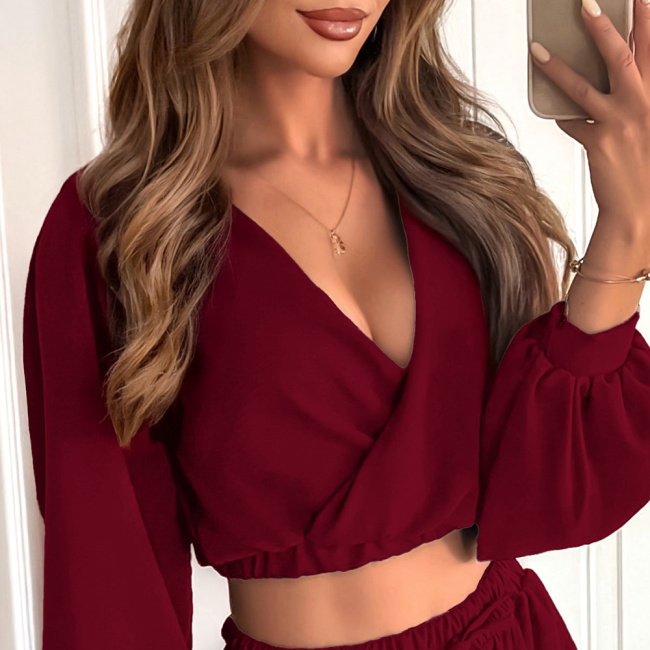 Bordowy komplet top z bufiastymi rękawami i długie spodnie Coralline