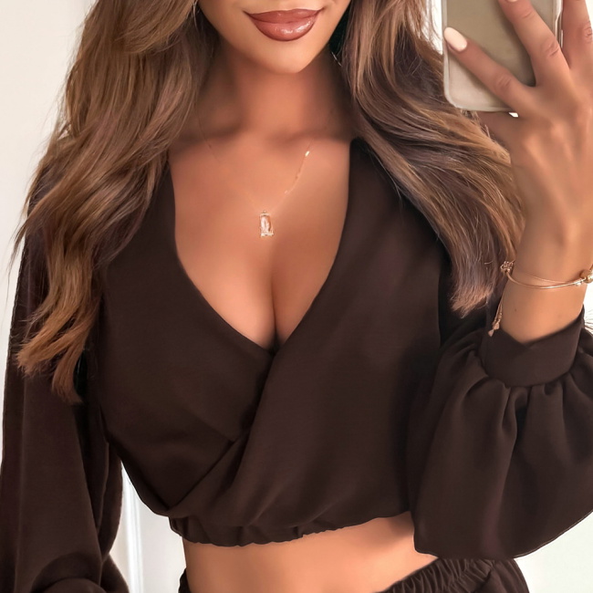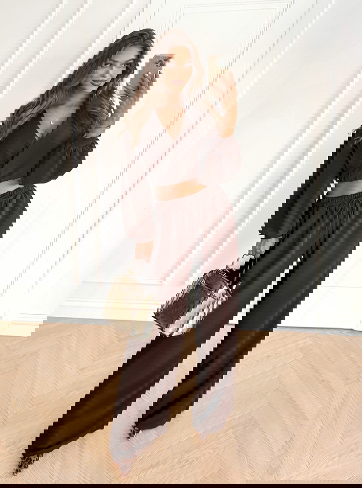 Czekoladowy komplet top z bufiastymi rękawami i długie spodnie Coralline