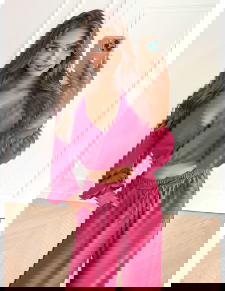 Komplet top z bufiastymi rękawami i długie spodnie Coralline - fuksja to stylizacja, która emanuje energią i kobiecym wdziękiem. Intensywny kolor fuksji przyciąga wzrok i dodaje odważnego, modowego charakteru. Top z bufiastymi rękawami sprawia, że całość wygląda lekko i nowocześnie. To detal, który podkreśla wyjątkowość zestawu i nadaje mu modnego akcentu. Długie spodnie o luźnym kroju zapewniają pełen komfort noszenia, a jednocześnie dodają elegancji. Razem tworzą harmonijną całość, idealną na wiele różnych okazji. Wyrazisty kolor świetnie współgra z prostym fasonem, dzięki czemu komplet prezentuje się efektownie. Fuksja to odcień, który doda świeżości każdej stylizacji. To idealna propozycja dla kobiet, które lubią bawić się modą i wyróżniać się z tłumu. Ten zestaw to połączenie wygody, elegancji i odwagi w jednym.