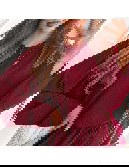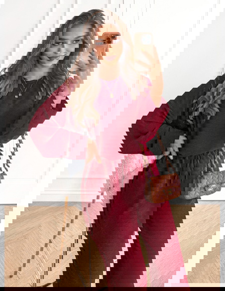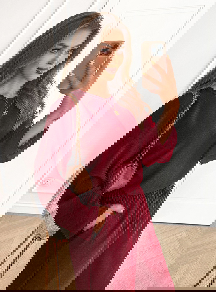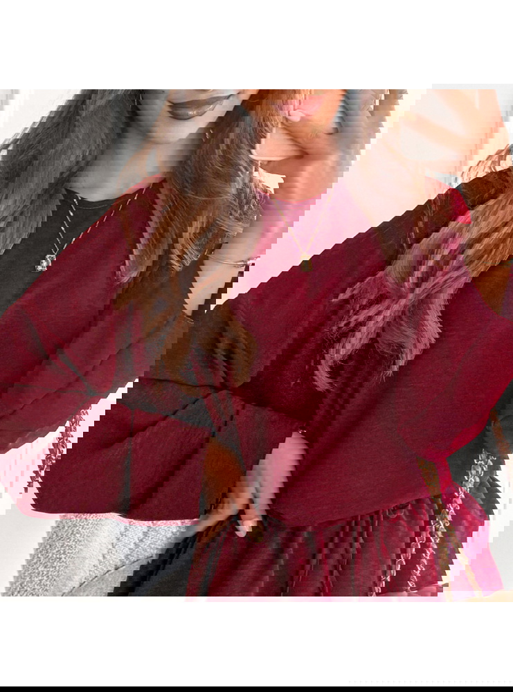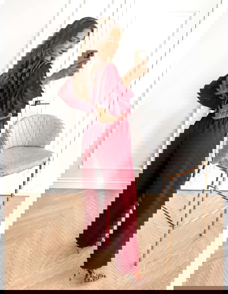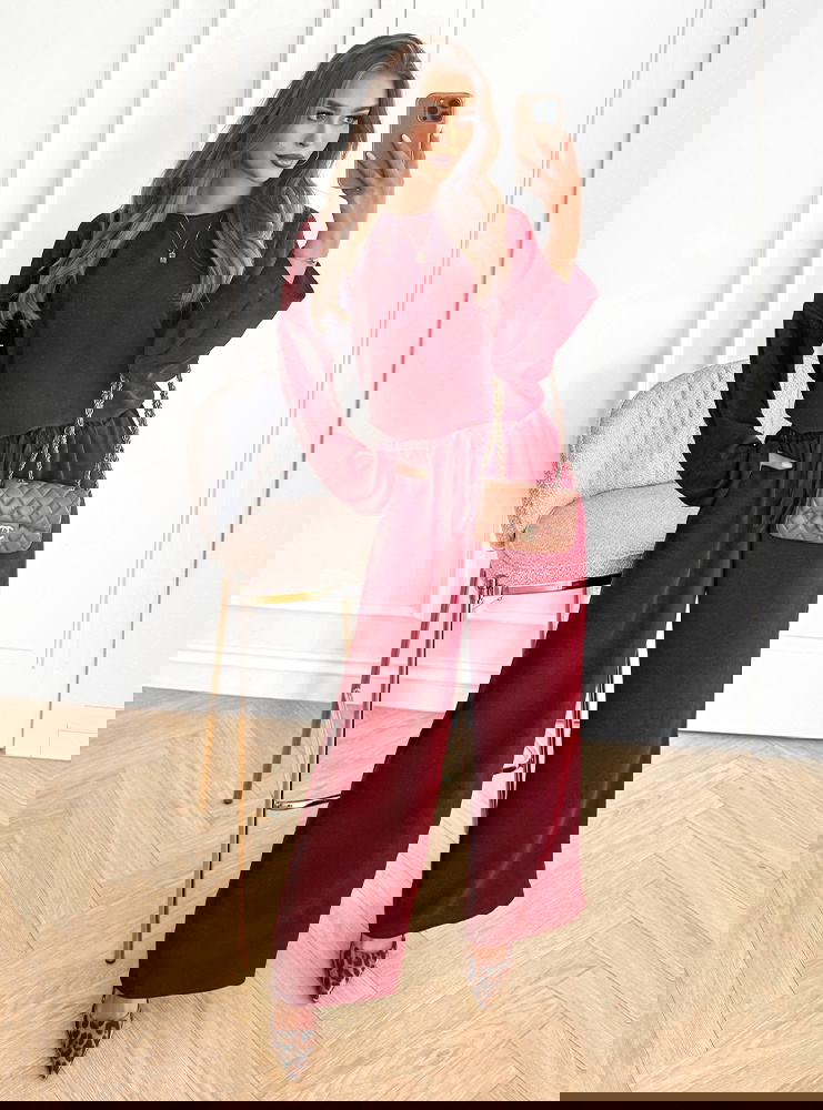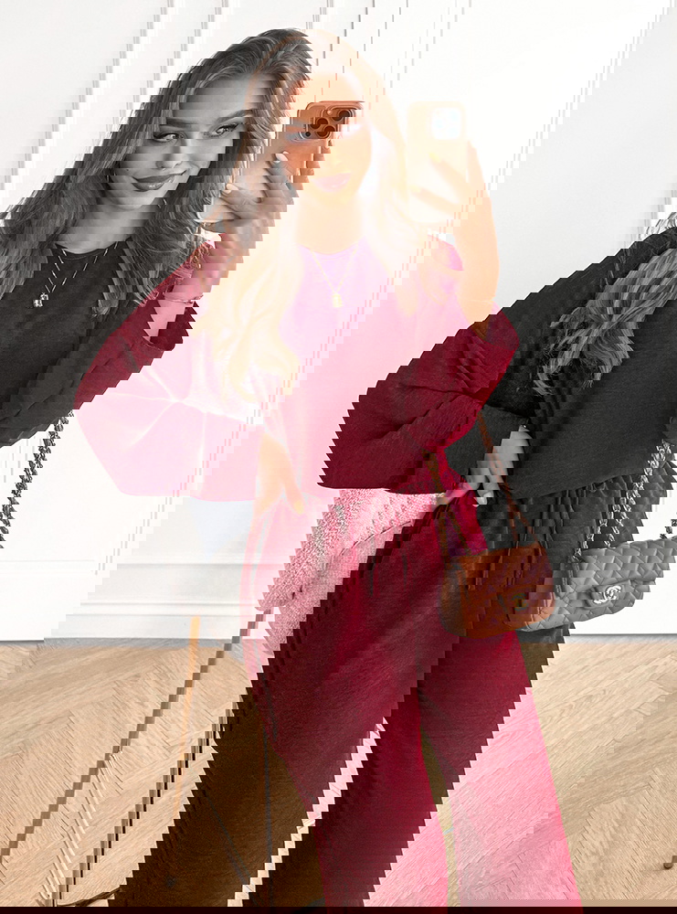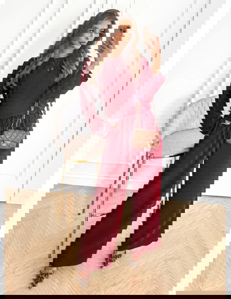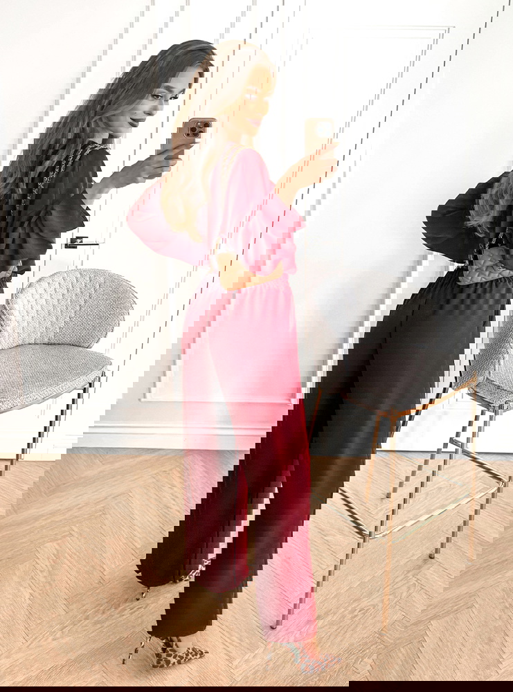 Bordowy komplet bluzka i spodnie Zimmia to propozycja, która od razu przyciąga uwagę elegancją i nowoczesnym stylem. To zestaw, który łączy w sobie wygodę i szyk, dzięki czemu sprawdzi się w wielu sytuacjach. Intensywny bordowy kolor dodaje mu klasy i wyrazistości, a jednocześnie podkreśla kobiecość. Luźniejsza bluzka z długim rękawem prezentuje się swobodnie i modnie. Spodnie o szerokich nogawkach nadają sylwetce lekkości i tworzą efekt wysmuklenia. Taki komplet to świetne rozwiązanie dla kobiet, które lubią czuć się komfortowo, a jednocześnie wyjątkowo stylowo. Jego prostota sprawia, że łatwo można go zestawić z różnymi dodatkami. To wybór, który pozwoli Ci stworzyć zarówno elegancki, jak i casualowy look. Każdy element tego zestawu idealnie się uzupełnia, tworząc spójną i efektowną całość. To komplet, który doskonale łączy nowoczesną formę z ponadczasową klasą.