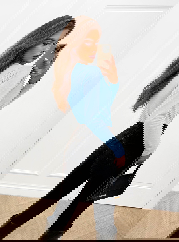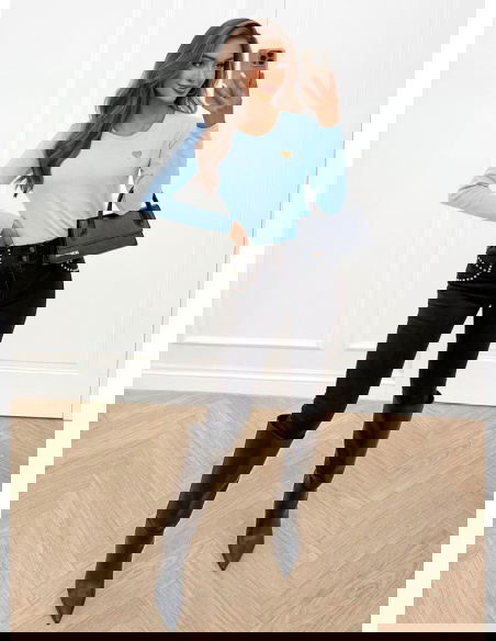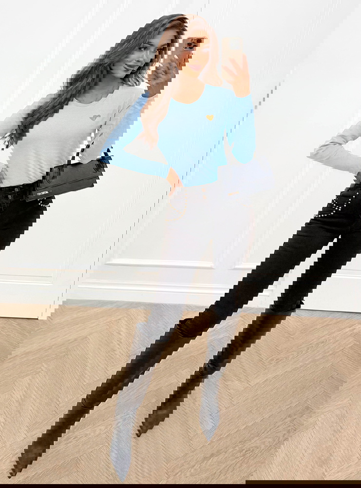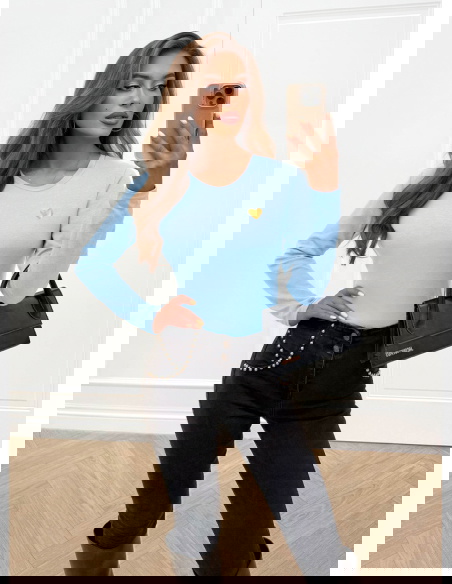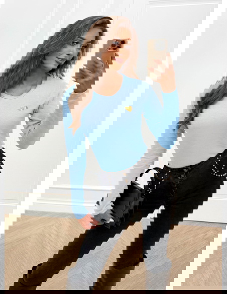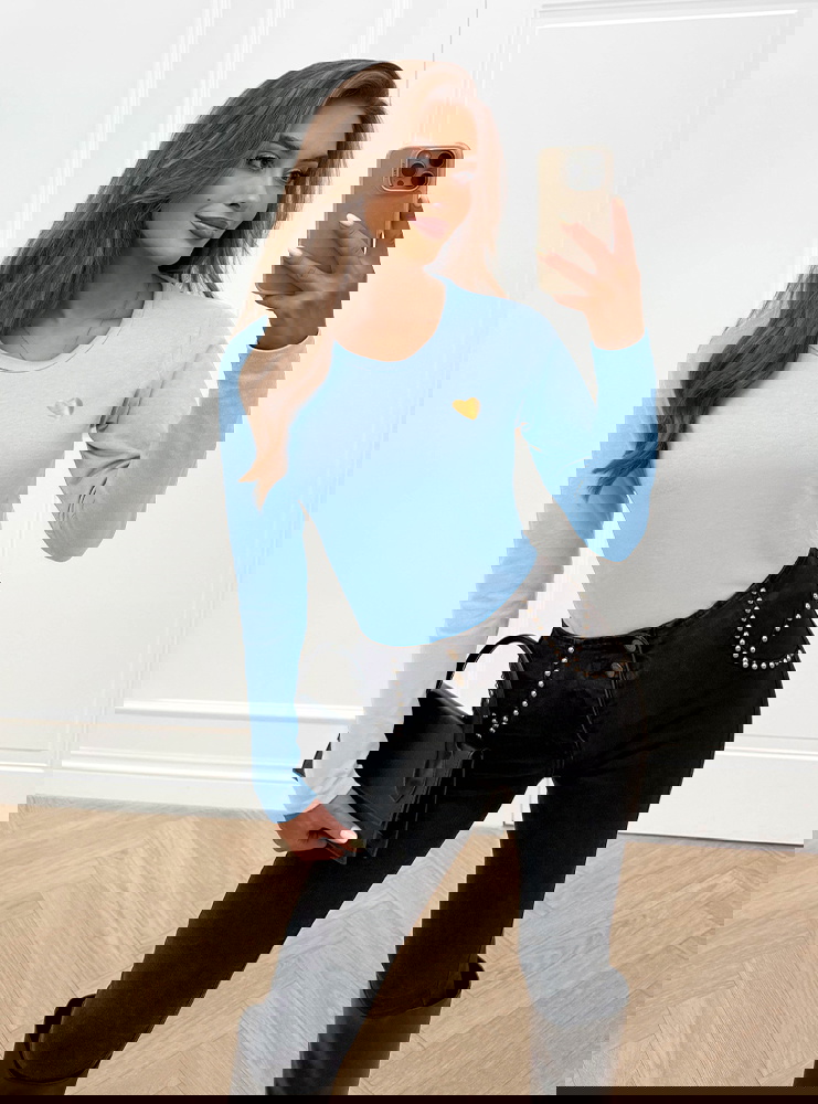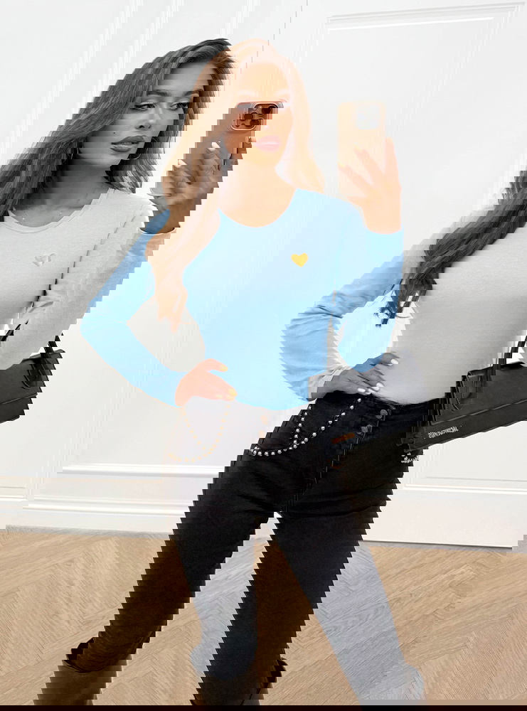 Błękitna koszulka na długi rękaw z ozdobnym nadrukiem Burnice to propozycja, która od razu przyciąga uwagę swoją świeżością i subtelnym urokiem. Delikatny błękit sprawia, że stylizacja nabiera lekkości i dziewczęcego charakteru. To model, który łączy w sobie prostotę z modnym detalem, czyniąc go wyjątkowym. Ozdobny nadruk w kształcie serduszka dodaje koszulce uroku i sprawia, że staje się ona niebanalnym elementem garderoby. Klasyczny krój z długim rękawem idealnie sprawdza się w codziennych stylizacjach. Koszulka prezentuje się stylowo, a jednocześnie pozostaje niezwykle uniwersalna. To propozycja dla kobiet, które cenią wygodę, ale lubią też podkreślić swój indywidualny styl. Niezależnie od okazji, ta koszulka zawsze będzie wyglądać świeżo i modnie. Dzięki stonowanemu kolorowi z łatwością dopasujesz ją do wielu elementów swojej garderoby. To klasyk z nutą nowoczesności, który świetnie uzupełni codzienne stylizacje.