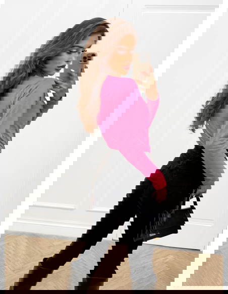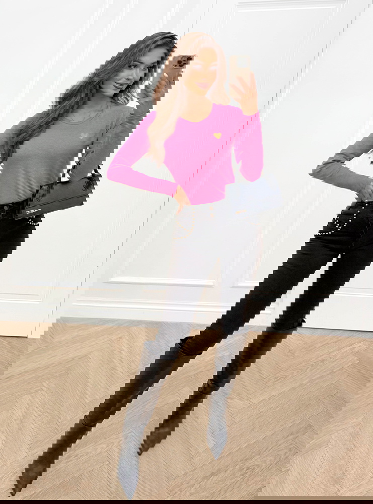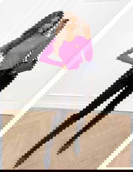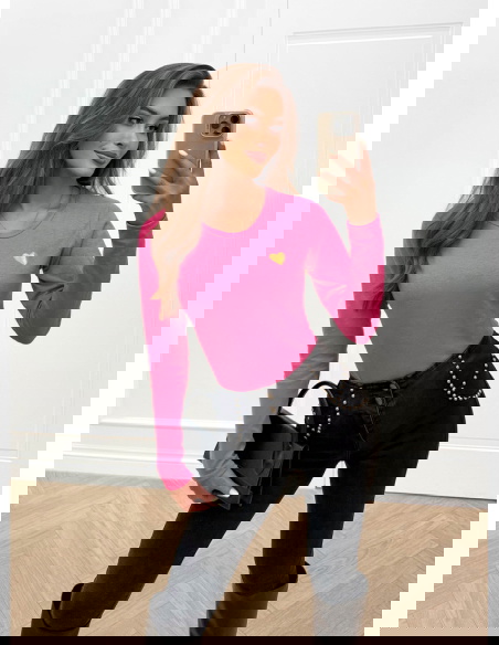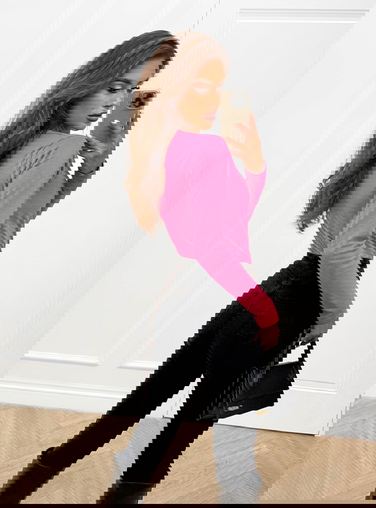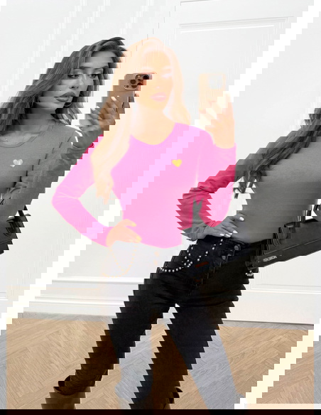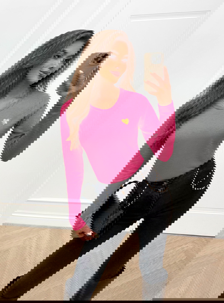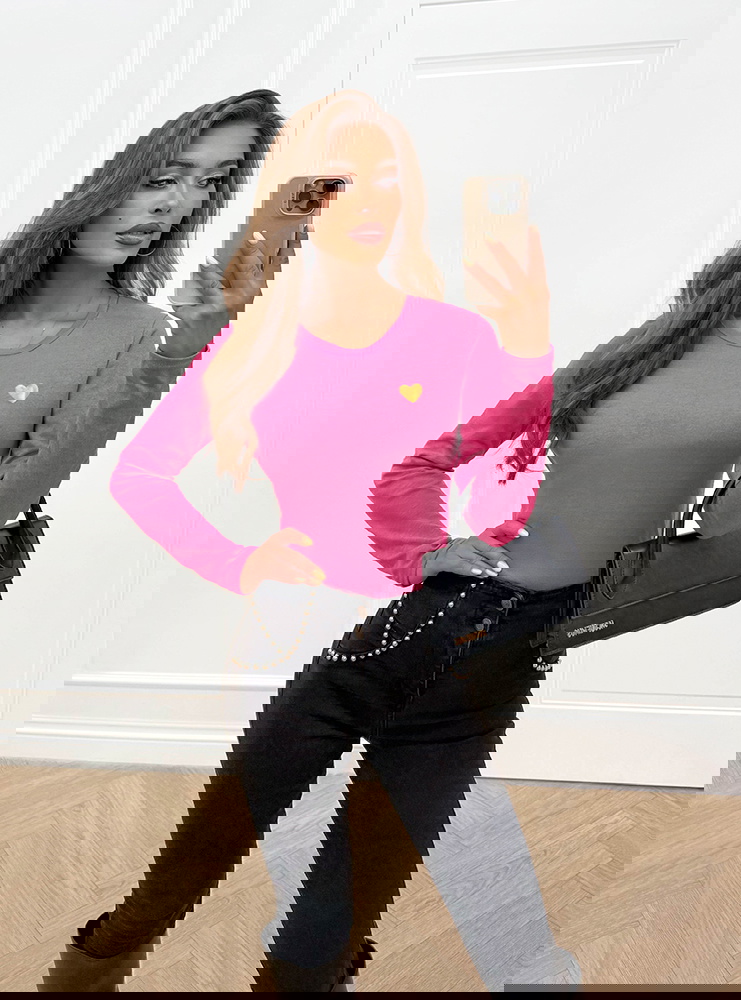 Koszulka na długi rękaw z ozdobnym nadrukiem Burnice - fuksja to energetyczna i kobieca propozycja, która doda charakteru każdej stylizacji. Jej intensywny kolor przyciąga uwagę i sprawia, że całość prezentuje się świeżo i modnie. Prosty, dopasowany krój podkreśla sylwetkę, pozostając przy tym wygodnym i praktycznym rozwiązaniem na co dzień. Delikatny nadruk w formie złotego serduszka dodaje całości subtelnej elegancji i uroku. To detal, który pięknie przełamuje jednolitą kolorystykę i czyni koszulkę wyjątkową. Model ten doskonale sprawdzi się jako baza wielu stylizacji – od casualowych, aż po te bardziej dopracowane. To koszulka, w której zawsze będziesz wyglądać modnie i kobieco. Jej uniwersalność i jednocześnie wyrazistość sprawiają, że szybko stanie się jednym z ulubionych elementów Twojej garderoby.