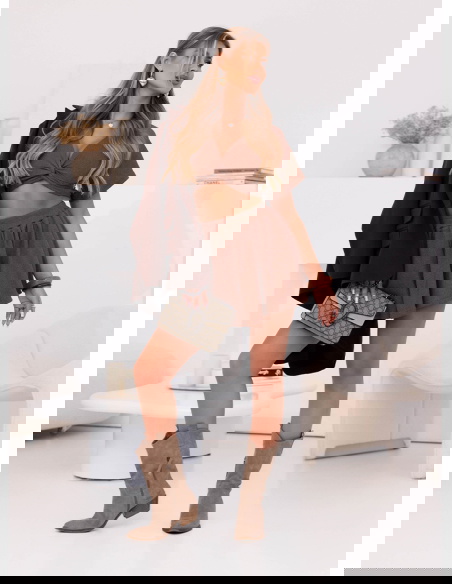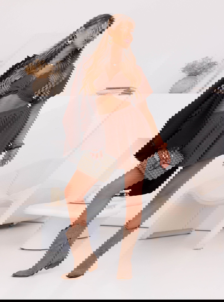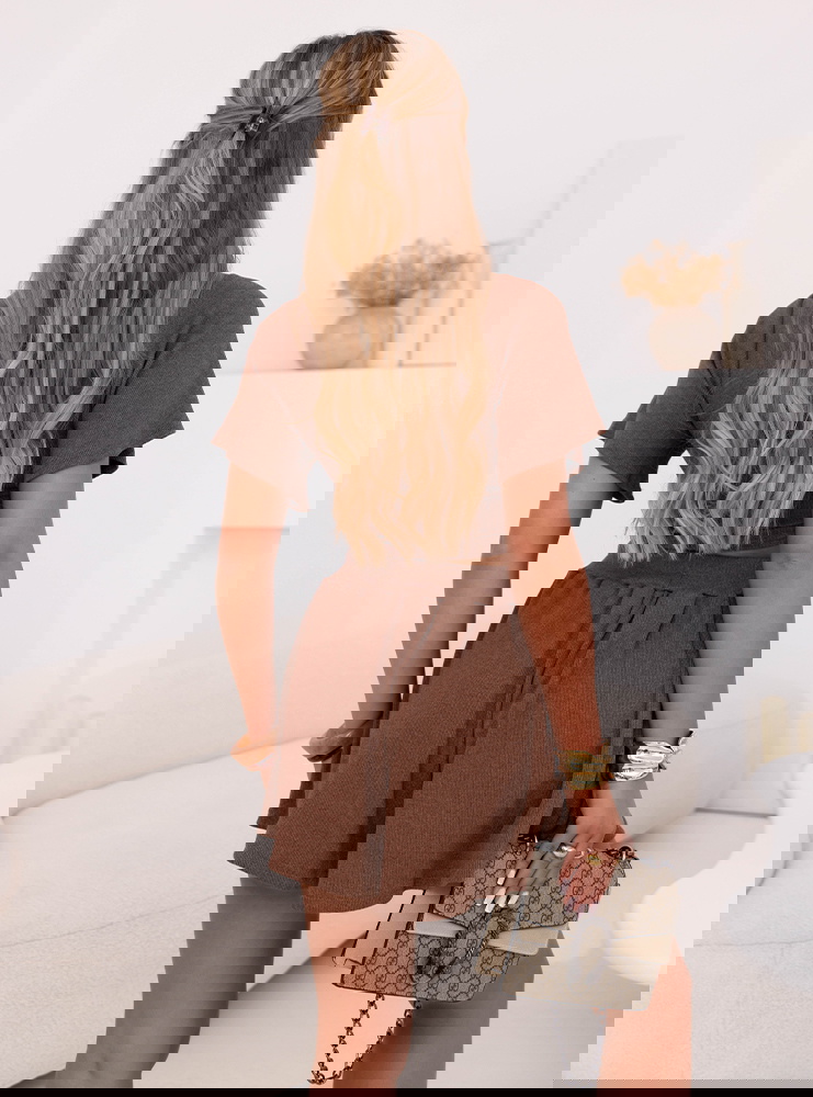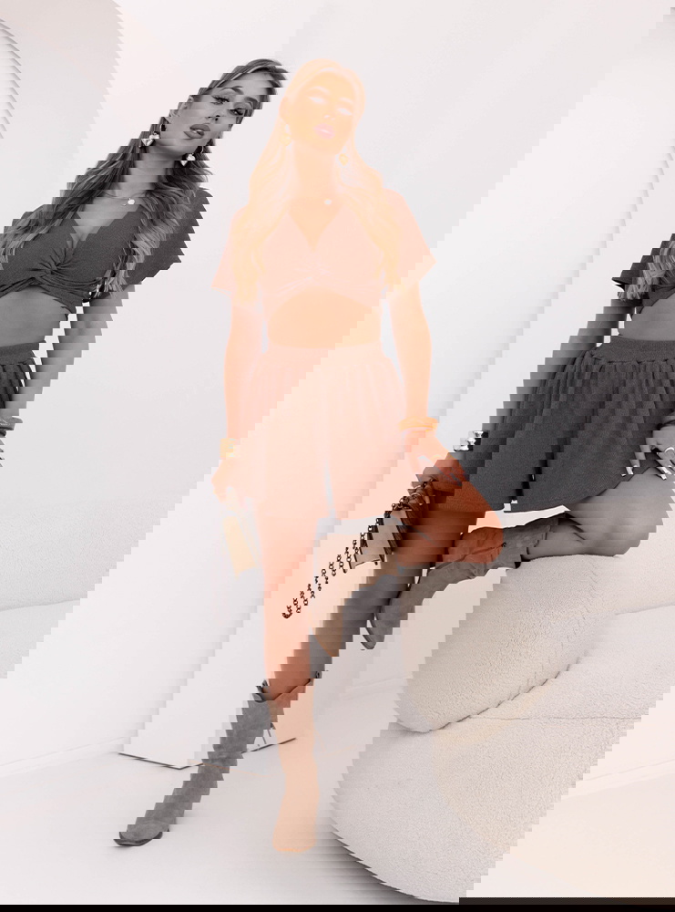 Komplet prążkowany top i szerokie spodenki Charllotte - mocha mousse to stylowa propozycja, która łączy modny wygląd i wygodę w jednym. To zestaw, który od razu przyciąga uwagę swoim nowoczesnym krojem i pięknym kolorem mocha mousse. Krótki top z efektownym twistem na przodzie podkreśla sylwetkę i dodaje całości kobiecego charakteru. Szerokie spodenki zapewniają swobodę ruchów i lekki, letni wygląd. To komplet, który możesz założyć zarówno na co dzień, jak i na wyjątkowe okazje w casualowym stylu. Wyróżnia się tym, że jest nie tylko modny, ale i praktyczny. Dzięki niemu stworzysz look, który będzie świeży, wygodny i niezwykle kobiecy. To zestaw, który idealnie wpisuje się w najnowsze trendy, a jednocześnie pozostaje bardzo komfortowy.