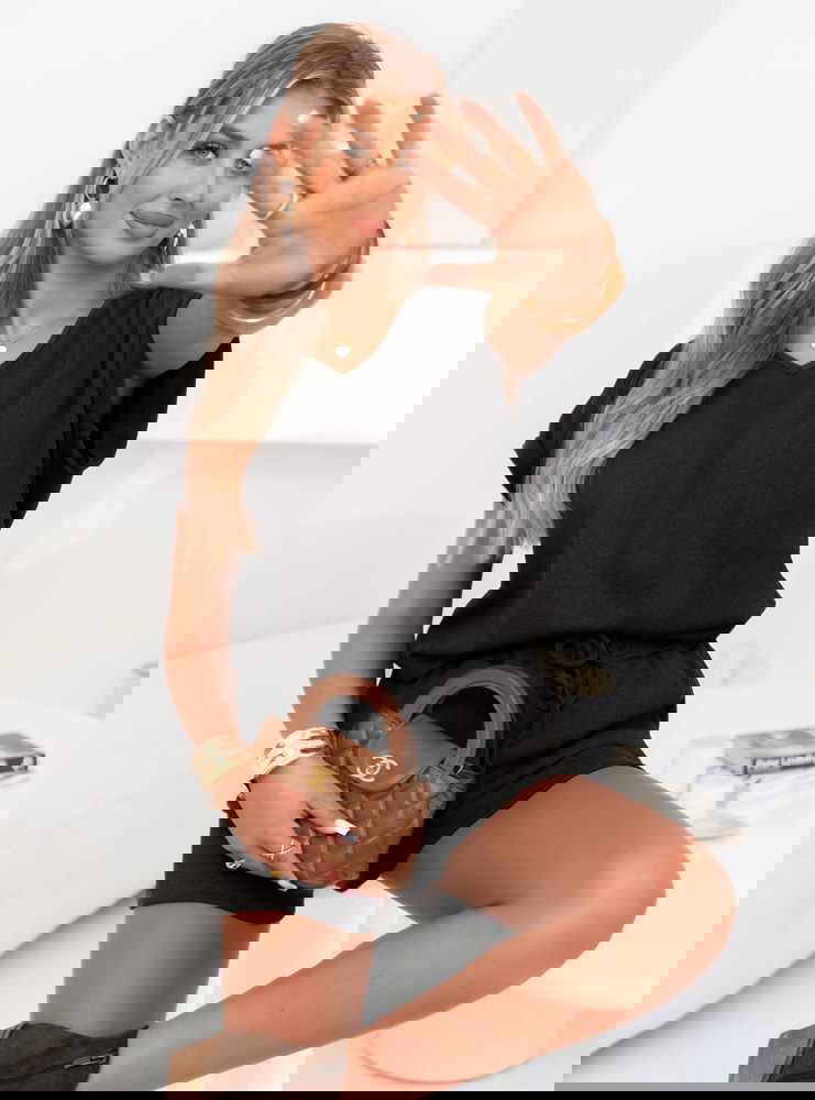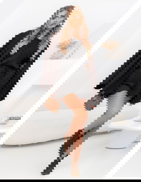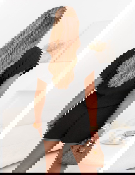 Czarny prążkowany komplet top i spodenki z wiązaniem Jesselah to komplet, który łączy miękkość dzianiny z nieformalną elegancją. Subtelnie prążkowany materiał przyjemnie otula ciało i pięknie się układa, a swobodny krój topu dodaje stylizacji luzu. Dekolt w kształcie litery „V” optycznie wysmukla szyję i ramiona, a krótkie rękawy z podwinięciem wprowadzają lekko sportowy charakter. Szorty z elastyczną talią i wiązaniem dopasowują się do sylwetki, gwarantując wygodę od rana do wieczora.