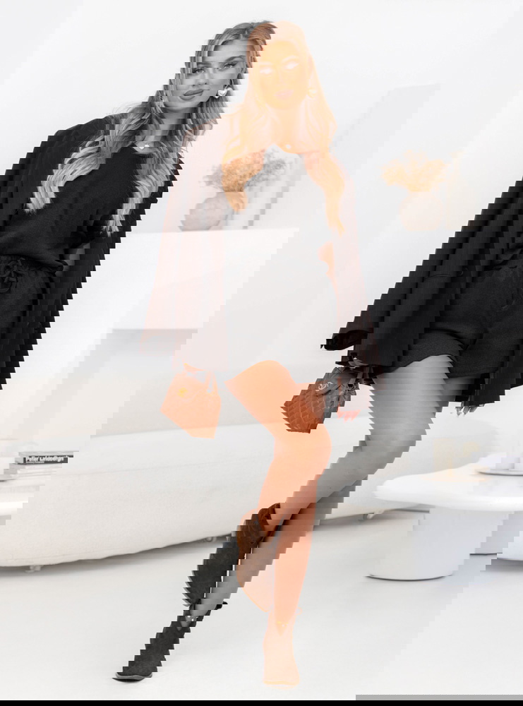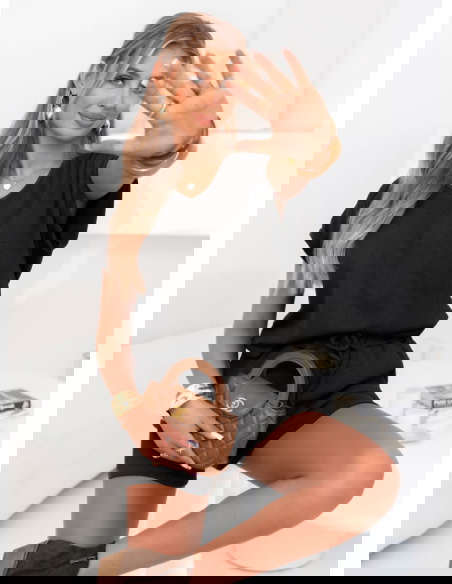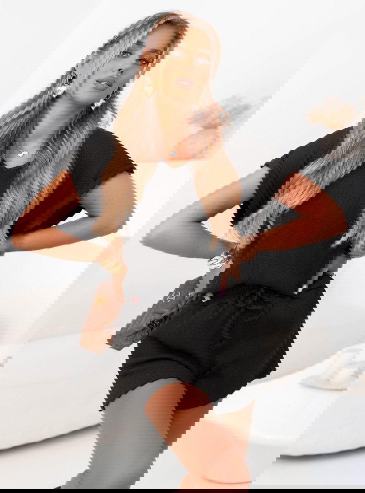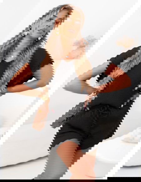Czarny prążkowany komplet top i spodenki z wiązaniem Jesselah to pewniak na ciepłe dni i nie tylko: miękki, elastyczny, łatwy w stylizacji. Prążkowana faktura dodaje charakteru, a regulowana talia szortów dba o pełen komfort.