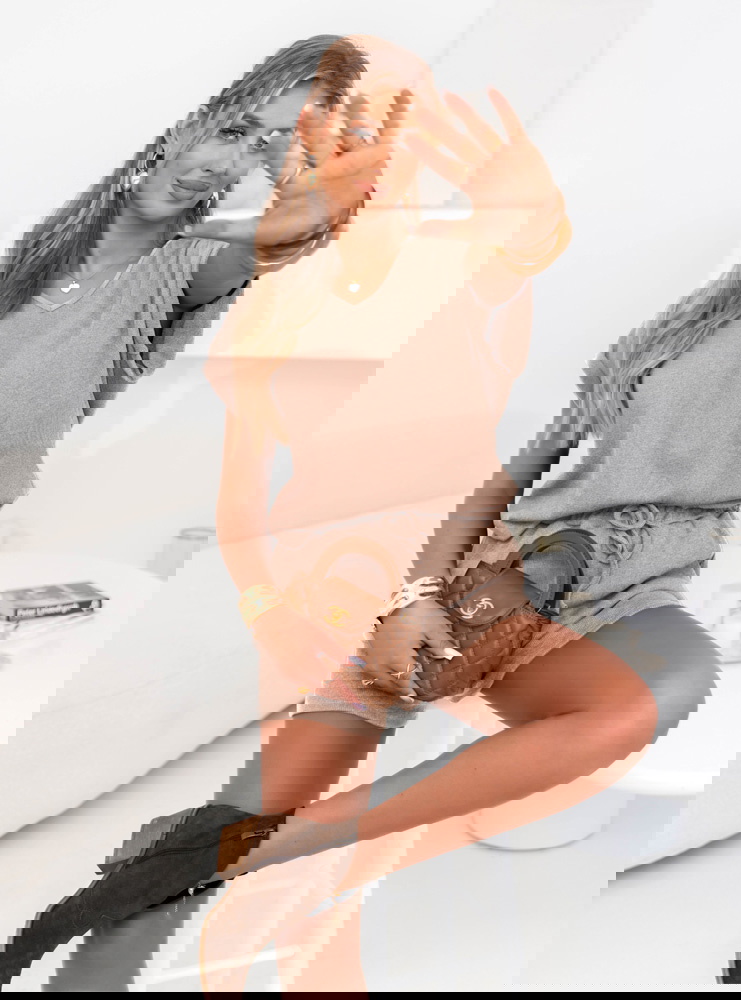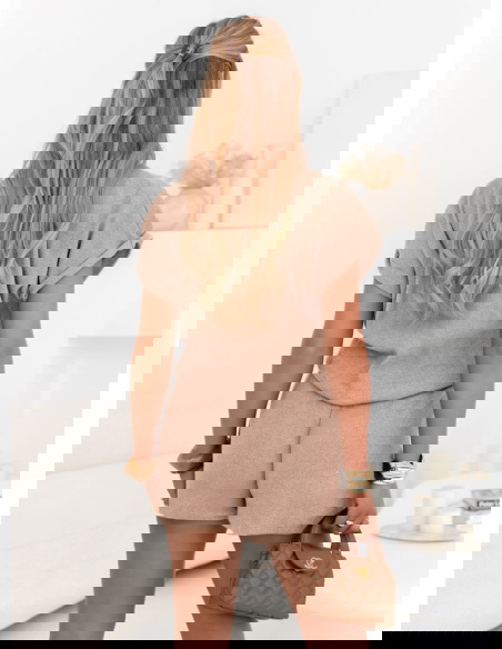 Beżowy prążkowany komplet top i spodenki z wiązaniem Jesselah to komplet, który łączy miękkość dzianiny z nieformalną elegancją. Subtelnie prążkowany materiał przyjemnie otula ciało i pięknie się układa, a swobodny krój topu dodaje stylizacji luzu. Dekolt w kształcie litery „V” optycznie wysmukla szyję i ramiona, a krótkie rękawy z podwinięciem wprowadzają lekko sportowy charakter. Szorty z elastyczną talią i wiązaniem dopasowują się do sylwetki, gwarantując wygodę od rana do wieczora.