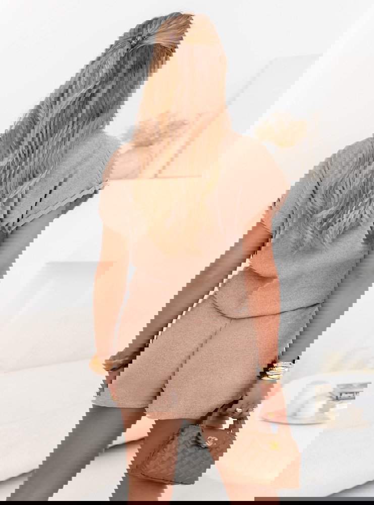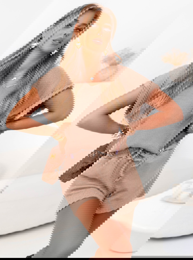 Beżowy prążkowany komplet top i spodenki z wiązaniem Jesselah