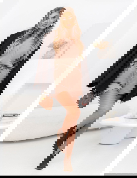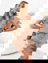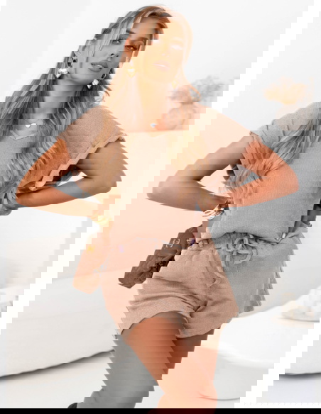 Beżowy prążkowany komplet top i spodenki z wiązaniem Jesselah to pewniak na ciepłe dni i nie tylko: miękki, elastyczny, łatwy w stylizacji. Prążkowana faktura dodaje charakteru, a regulowana talia szortów dba o pełen komfort.