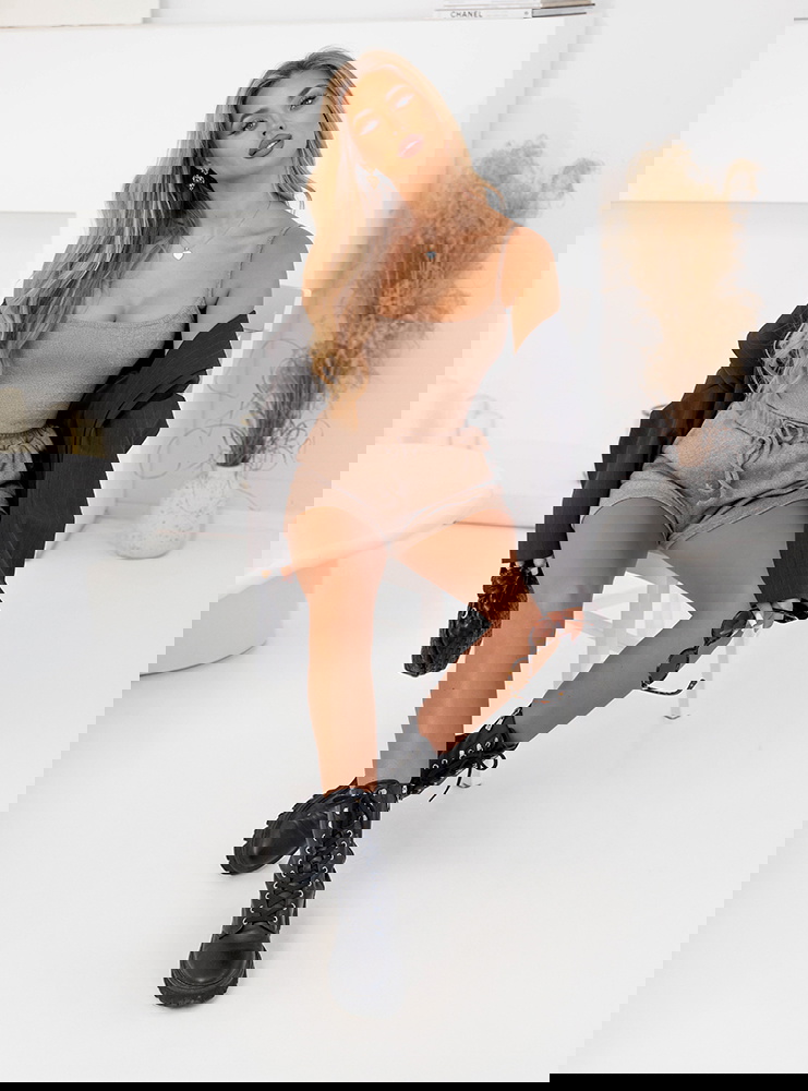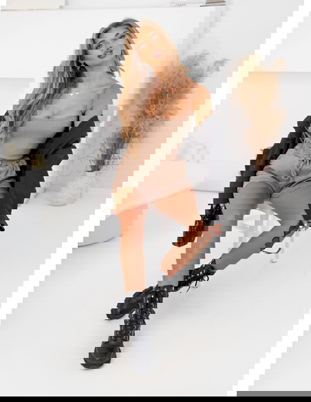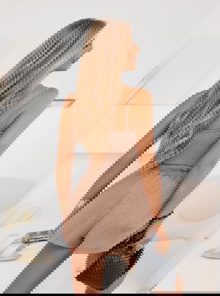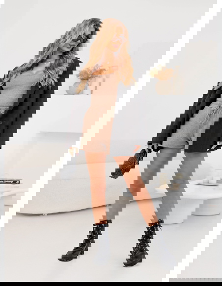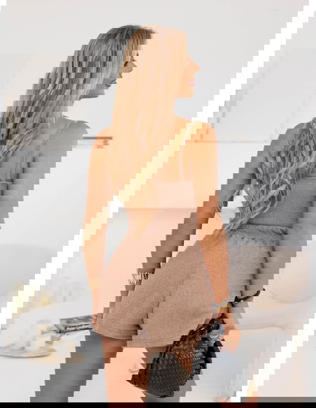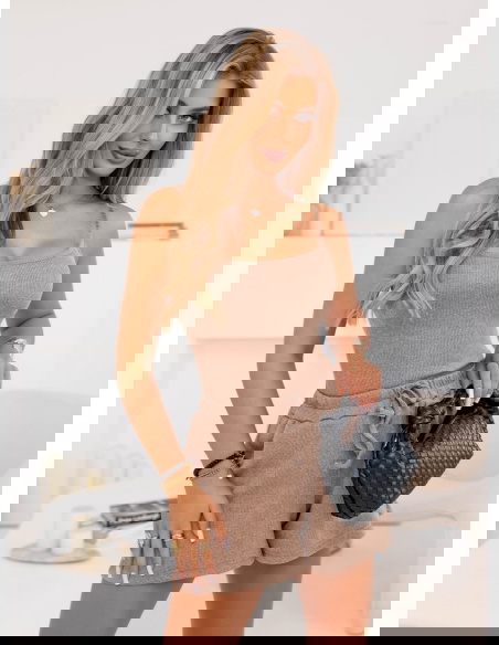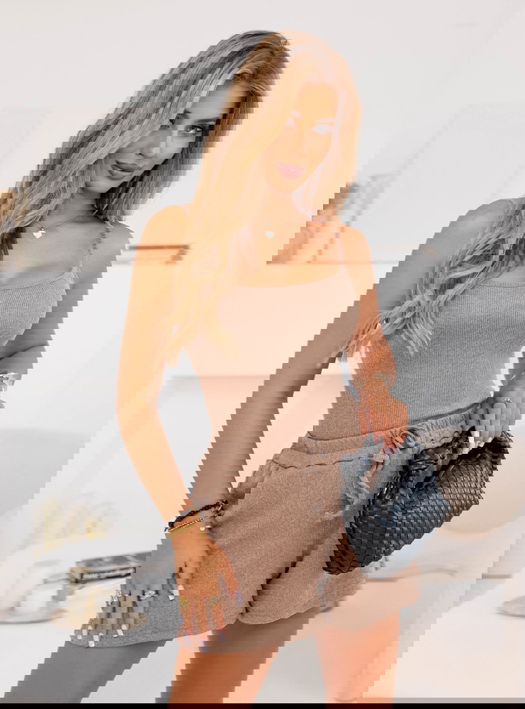 Beżowy prążkowany komplet bluzka na ramiączkach + spodenki Hunnie to zgrywka komfortu i prostoty, która zawsze wygląda świeżo. Prążkowana, elastyczna dzianina dopasowuje się do sylwetki, a podwyższony stan szortów podkreśla talię i dba o wygodę.
