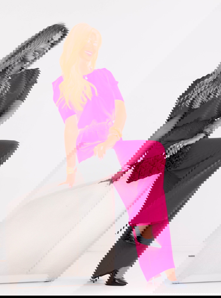 Komplet bluzka i szerokie spodnie z wiązaniem Lloydine - fuksja to połączenie odważnego koloru i klasycznego fasonu. Luźna bluzka i szerokie spodnie tworzą wygodny, a zarazem elegancki zestaw.