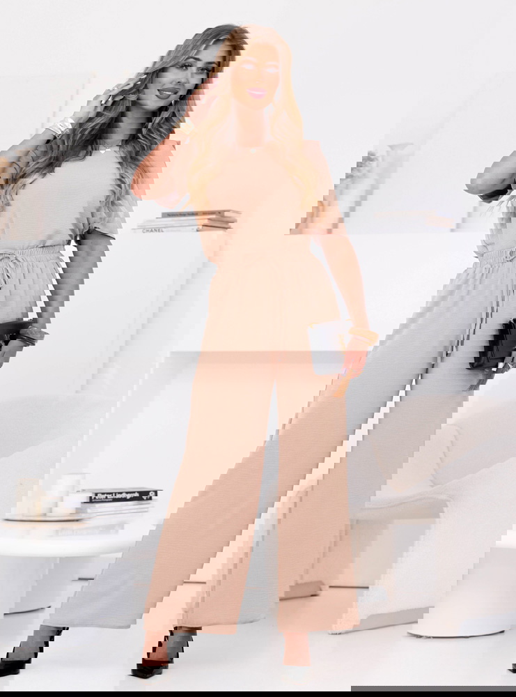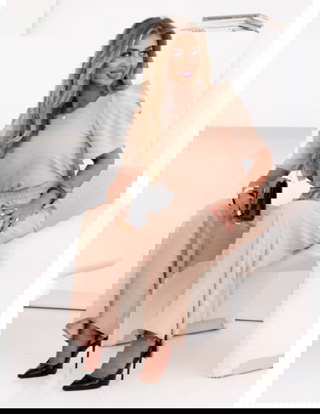 Beżowy komplet bluzka i szerokie spodnie z wiązaniem Lloydine to wyjątkowa propozycja, która zachwyca swoją prostotą i elegancją. Od pierwszego spojrzenia widać, że to zestaw stworzony z myślą o nowoczesnej kobiecie, ceniącej ponadczasowy styl. Neutralny beż pięknie podkreśla urodę i pasuje do każdego typu karnacji. Luźna bluzka z krótkim rękawem nadaje całości lekkości i subtelnego wdzięku. Spodnie z szerokimi nogawkami prezentują się niezwykle szykownie i optycznie wydłużają sylwetkę. Wiązanie w talii sprawia, że figura zyskuje piękne proporcje. To komplet, który idealnie łączy wygodę i modowy charakter. W nim każda kobieta poczuje się pewnie i stylowo. Doskonały zarówno na co dzień, jak i na bardziej wyjątkowe okazje. To klasyk, który zawsze będzie w modzie.