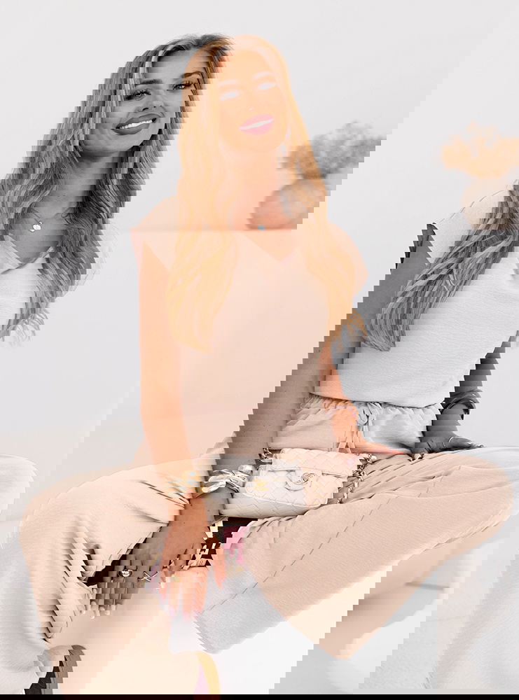 Beżowy komplet bluzka z krótkim rękawem i spodnie Sonnie sprawdzi się podczas codziennych obowiązków i spotkań ze znajomymi. To doskonały wybór na spokojny dzień w pracy w mniej formalnym wydaniu.