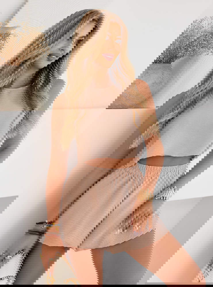 Beżowy komplet bluzka i spodenki Ymir to połączenie wygody i modnej prostoty. Krótka bluzka i spodenki tworzą spójny zestaw, który wygląda lekko i stylowo.