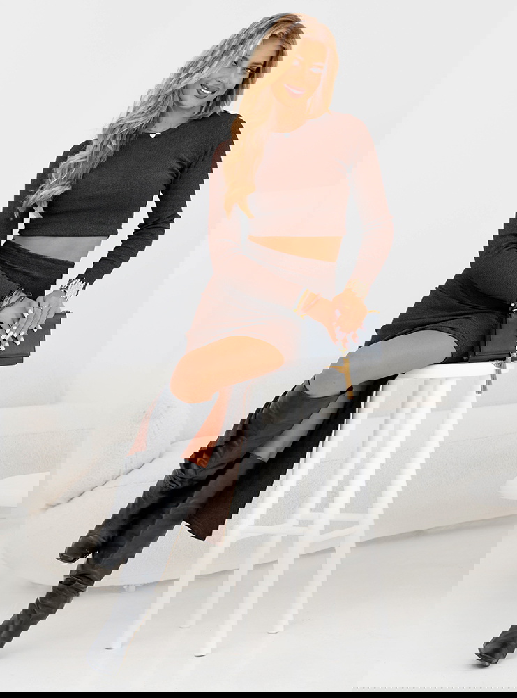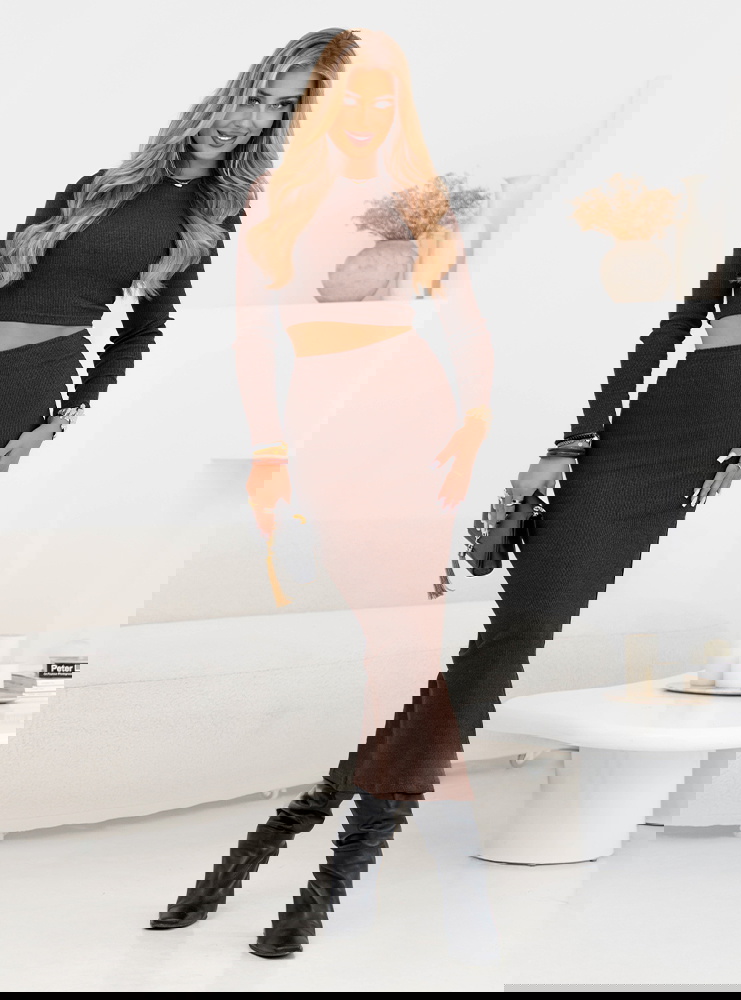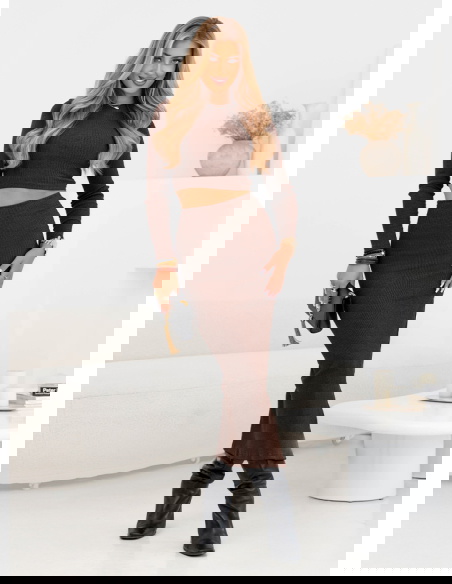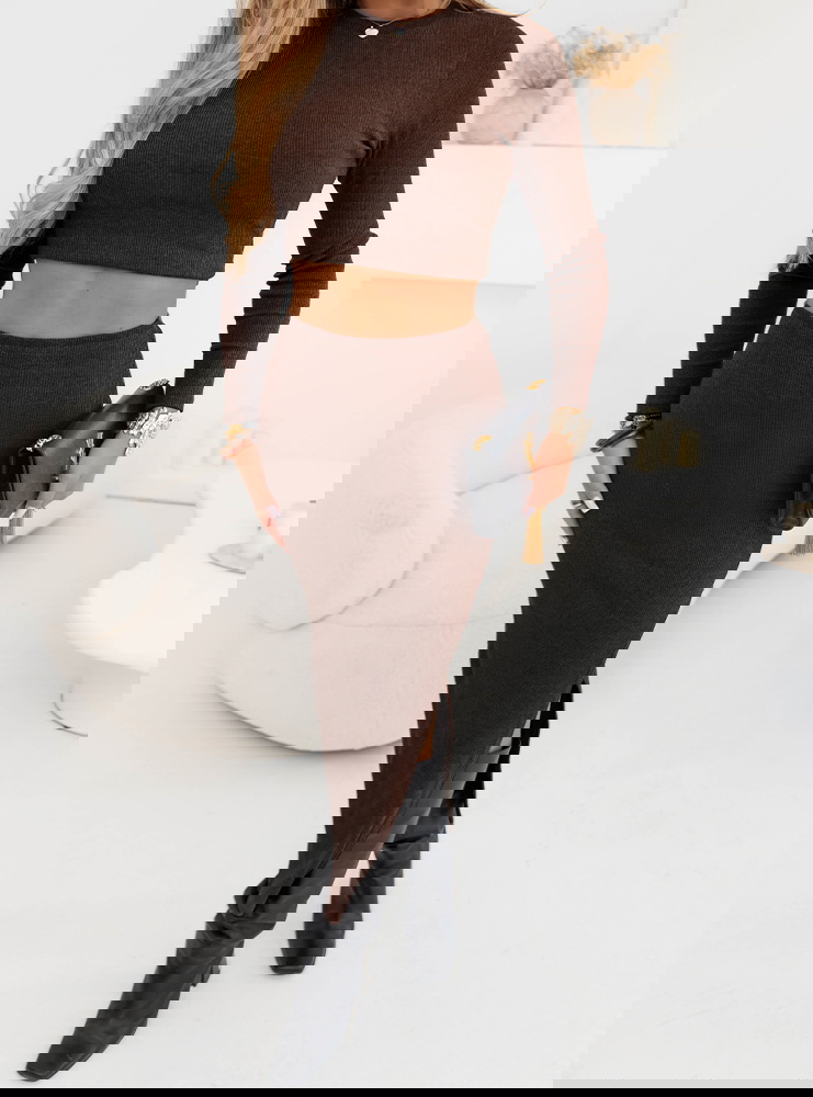 Czekoladowy prążkowany komplet top+spódnica z rozcięciem Hyuna idealnie sprawdzi się na wieczorne wyjścia, kiedy chcesz wyglądać kobieco i stylowo. To doskonała opcja na randkę, ponieważ subtelnie podkreśla atuty sylwetki.