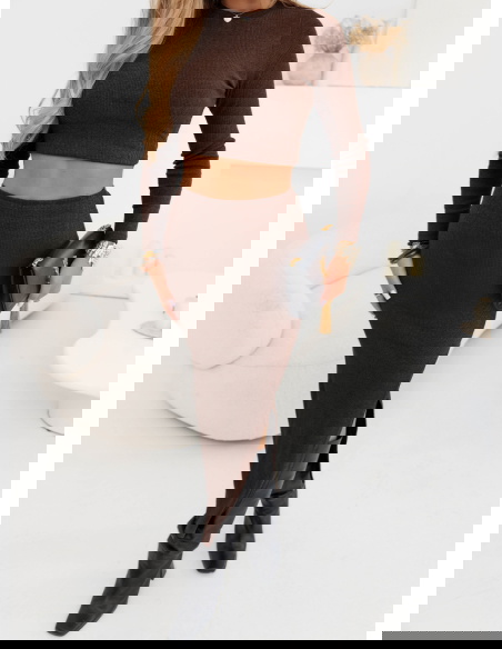 Czekoladowy prążkowany komplet top+spódnica z rozcięciem Hyuna