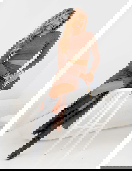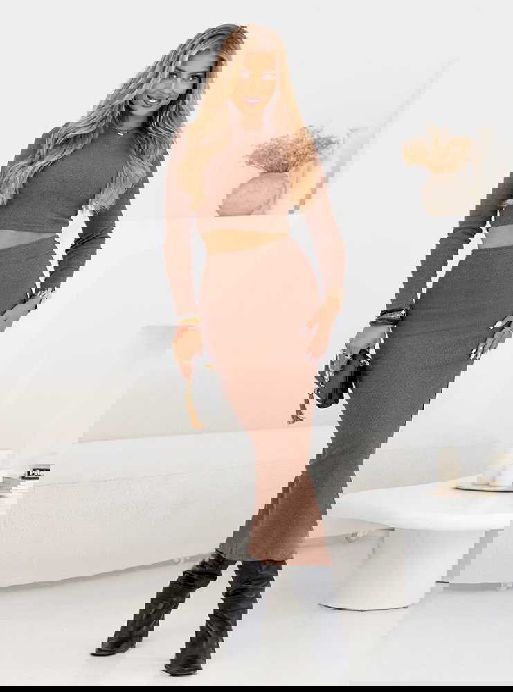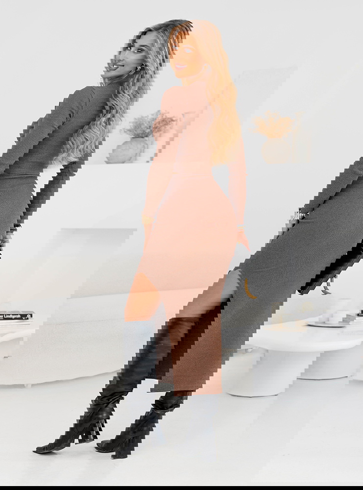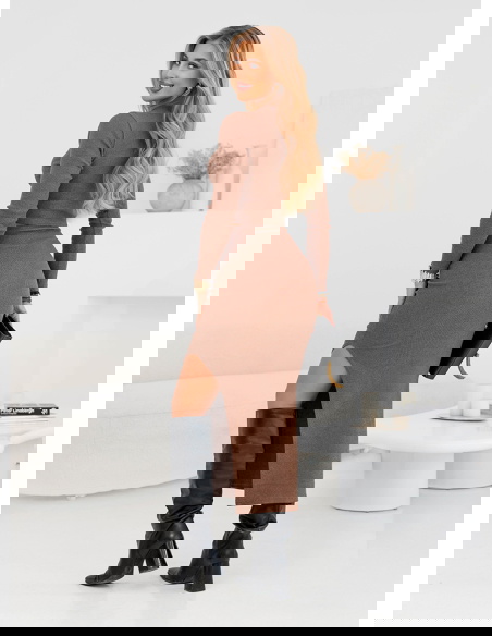 Prążkowany komplet top+spódnica z rozcięciem Hyuna - mocha mousse to zestaw, który od pierwszego spojrzenia zachwyca elegancją i nowoczesnym charakterem. To propozycja, która łączy w sobie kobiecość i wygodę w idealnych proporcjach. Dopasowany top podkreśla sylwetkę i nadaje całości subtelnego wdzięku. Spódnica midi z rozcięciem pięknie eksponuje nogi, dodając stylizacji lekkości i odrobiny zmysłowości. Komplet ten doskonale wpisuje się w najnowsze trendy, jednocześnie zachowując ponadczasowy urok. Neutralny odcień mocha mousse sprawia, że całość prezentuje się niezwykle elegancko i uniwersalnie. To zestaw, w którym bez wysiłku stworzysz kompletną stylizację. Minimalistyczna forma daje wiele możliwości łączenia z dodatkami. To propozycja, która pasuje zarówno do codziennych, jak i wyjątkowych okazji. Dzięki temu kompletowi każda kobieta może poczuć się modnie, kobieco i pewnie.
