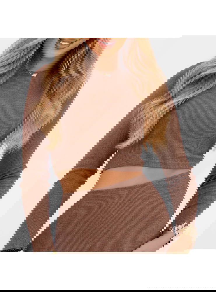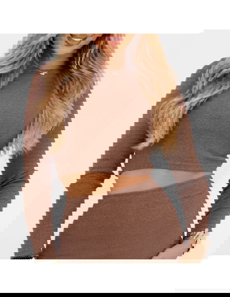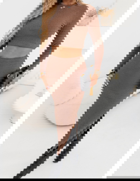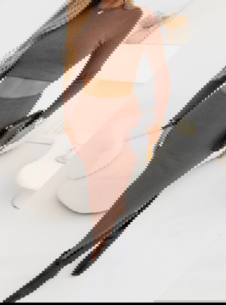 Prążkowany komplet top+spódnica z rozcięciem Hyuna - mocha mousse