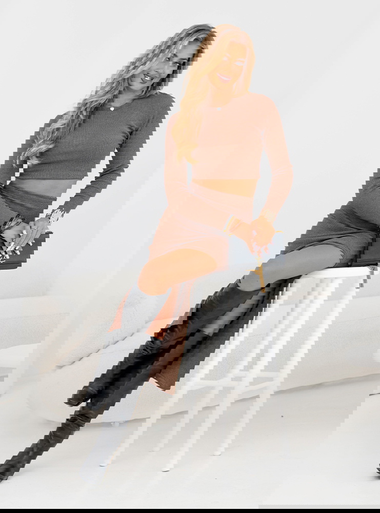 Prążkowany komplet top+spódnica z rozcięciem Hyuna - mocha mousse będzie doskonałym wyborem na spotkania z przyjaciółmi, kiedy chcesz wyglądać wyjątkowo. Idealnie sprawdzi się także podczas randki, podkreślając kobiecy urok i pewność siebie.