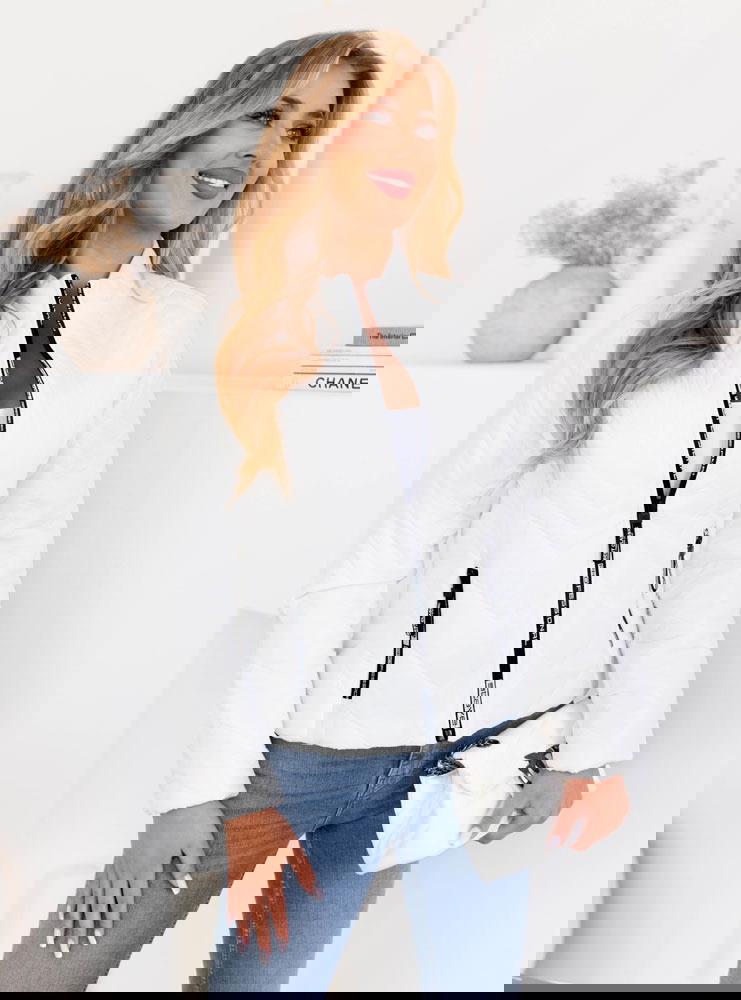 Biała pikowana kurtka Meropi sprawdzi się w codziennych stylizacjach, dodając im eleganckiego charakteru. Będzie świetnym wyborem na spotkania ze znajomymi czy rodziną.