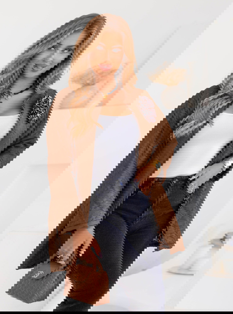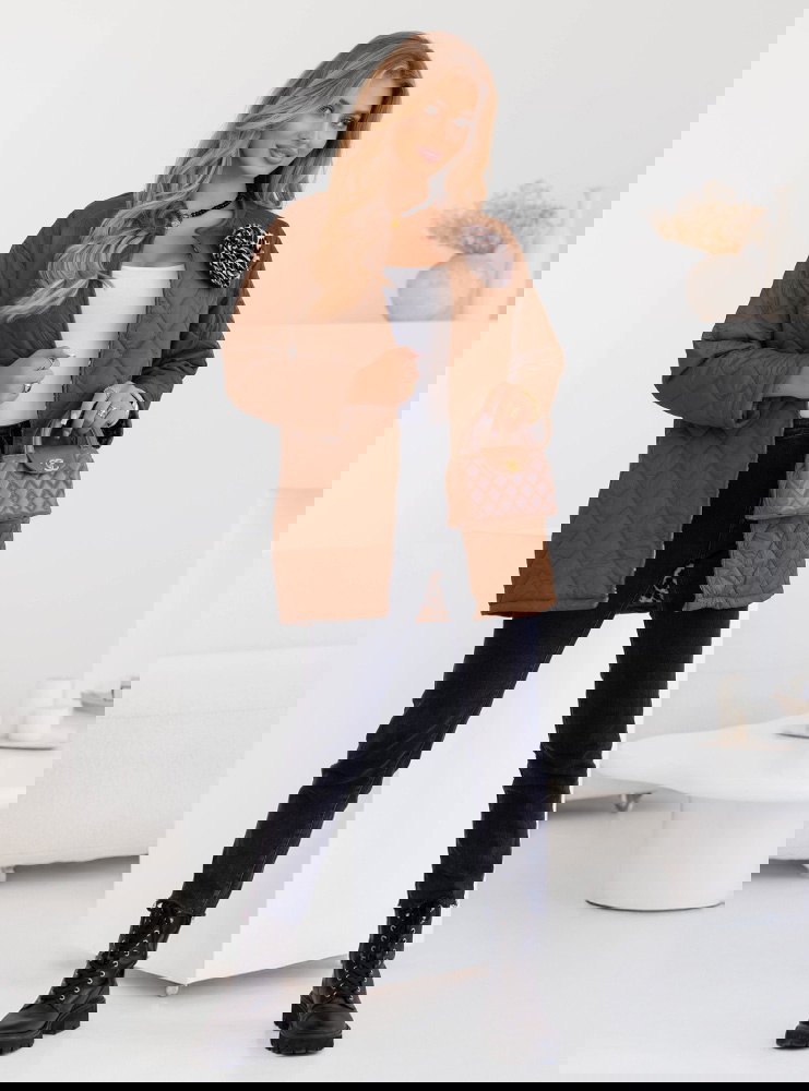 Pikowana kurtka z ozdobną broszką w kształcie róży Ronella - mocha mousse to model, który łączy praktyczność z eleganckim wykończeniem. Jej charakterystyczny design sprawia, że od razu przyciąga spojrzenia. Pikowany wzór nadaje jej nowoczesności i wyjątkowego charakteru. Ozdobna broszka w kształcie róży dodaje całości niepowtarzalnego uroku i subtelnej kobiecości. To kurtka, która wyróżnia się spośród klasycznych modeli i nadaje stylizacji indywidualnego akcentu. Jej fason jest wygodny, a jednocześnie świetnie układa się na sylwetce. Neutralny odcień mocha mousse podkreśla uniwersalność i pozwala na swobodne łączenie z różnymi elementami garderoby. To propozycja, która doskonale sprawdzi się u kobiet ceniących zarówno komfort, jak i styl. Dzięki niej nawet codzienna stylizacja nabierze eleganckiego wyrazu. To model, który podkreśla pewność siebie i dobry gust właścicielki.