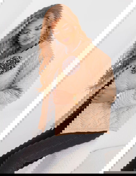 Beżowa pikowana kurtka z ozdobną broszką w kształcie róży Jalita to wyjątkowa propozycja dla kobiet ceniących połączenie wygody i elegancji. Jej klasyczny kolor sprawia, że łatwo dopasować ją do różnych stylizacji.