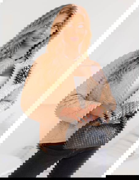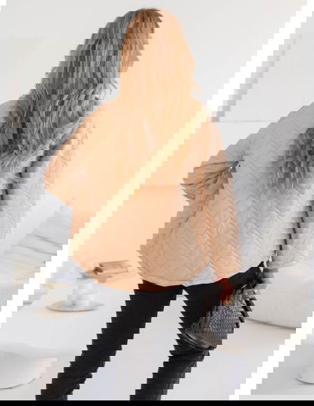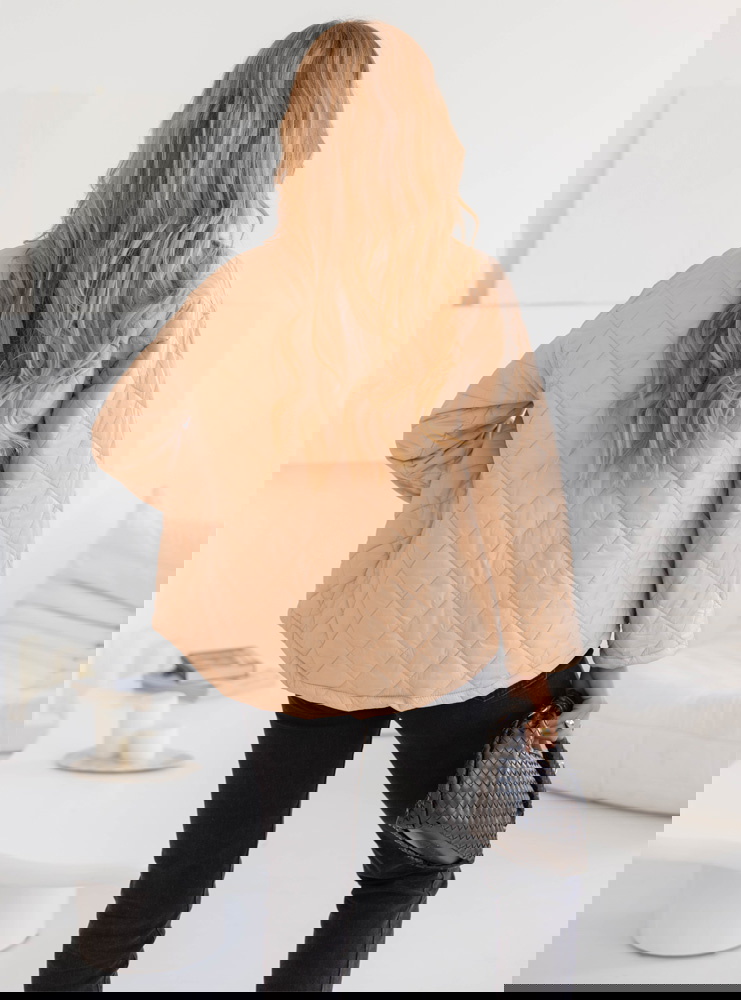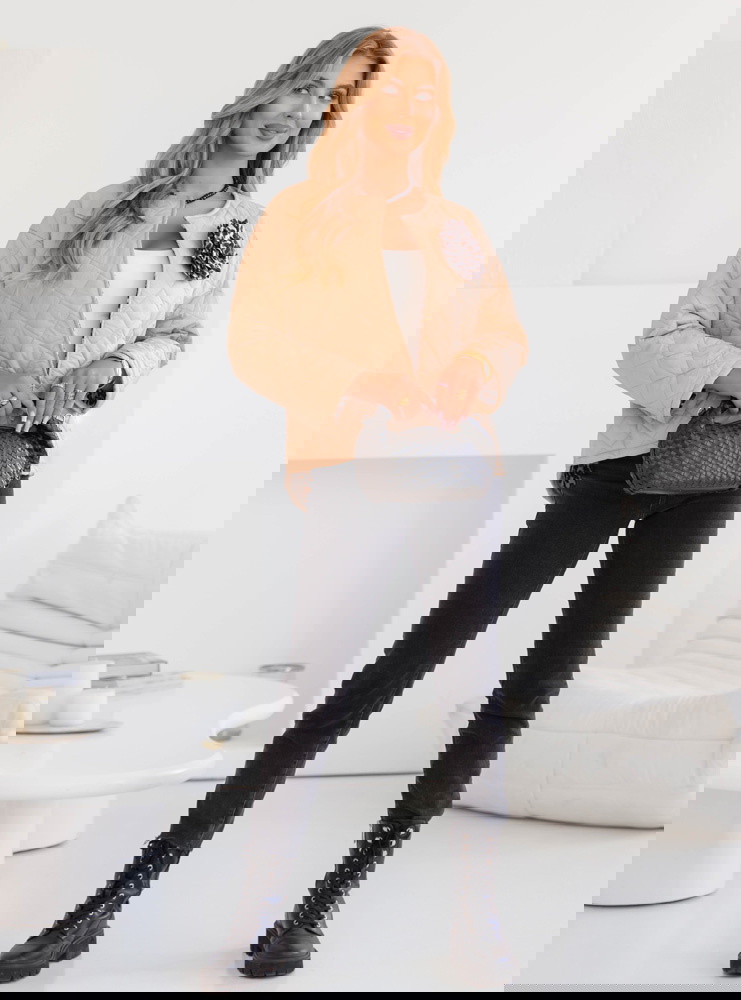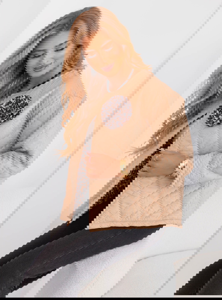 Beżowa pikowana kurtka z ozdobną broszką w kształcie róży Jalita to model, który łączy w sobie elegancję i subtelną oryginalność. Jej klasyczny kolor sprawia, że pasuje do wielu stylizacji, a jednocześnie dodaje im lekkości. Pikowany wzór nadaje kurtce nowoczesnego charakteru i sprawia, że prezentuje się wyjątkowo. Ozdobna broszka w kształcie róży przyciąga uwagę i czyni ten model unikalnym. To propozycja, która świetnie sprawdzi się w garderobie kobiet ceniących modne, a zarazem praktyczne rozwiązania. Dzięki niej każda stylizacja nabierze indywidualnego charakteru. To kurtka, która dodaje szyku nawet najprostszej stylizacji. Jej prosty krój zapewnia wygodę noszenia, nie rezygnując z eleganckiego wyglądu. To element garderoby, który podkreśla kobiecość i nadaje całości klasy. To wybór idealny dla kobiet, które chcą czuć się stylowo każdego dnia.