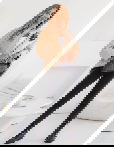 Beżowa pikowana kurtka z ozdobną broszką w kształcie róży Jalita