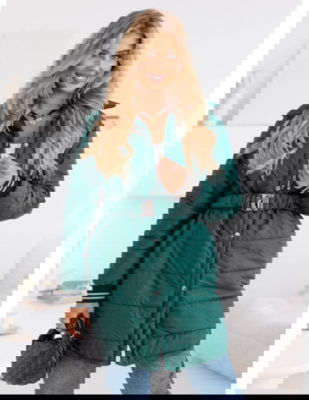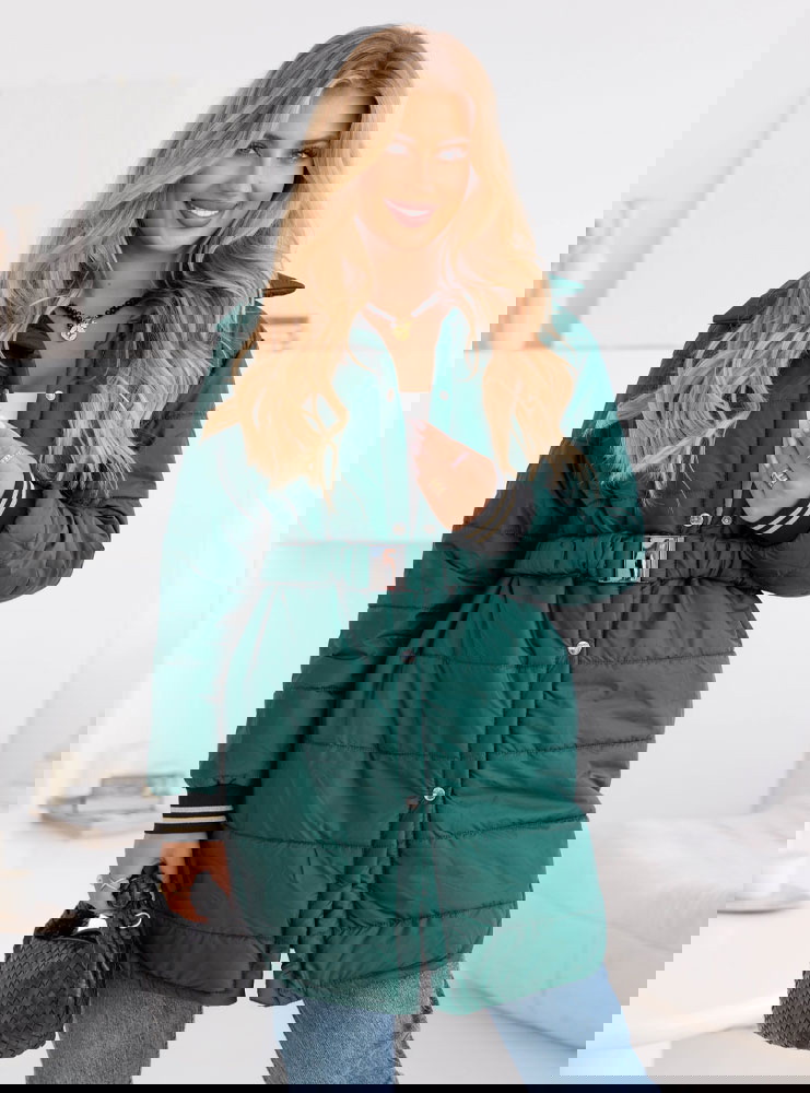 Pikowany płaszcz z paskiem Souleah - butelkowa zieleń to model, który wyróżnia się eleganckim kolorem i nowoczesnym krojem. Jego pikowana struktura dodaje charakteru, a pasek pięknie podkreśla talię.