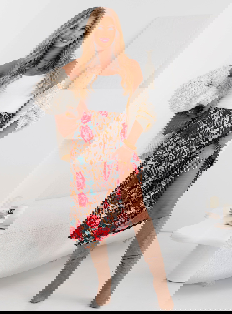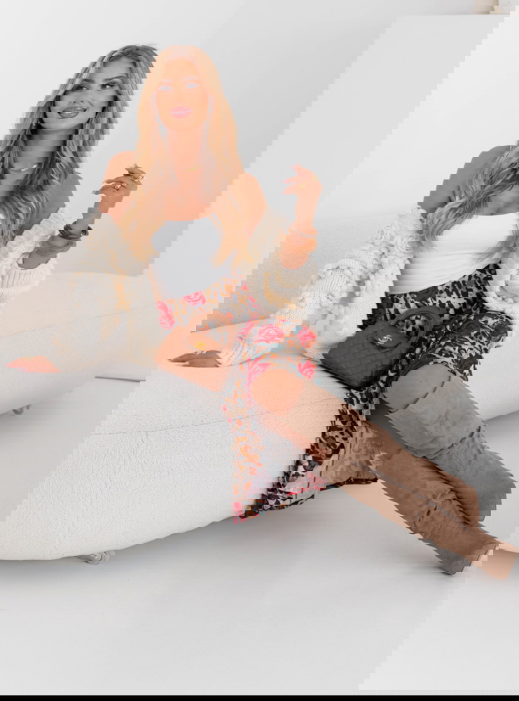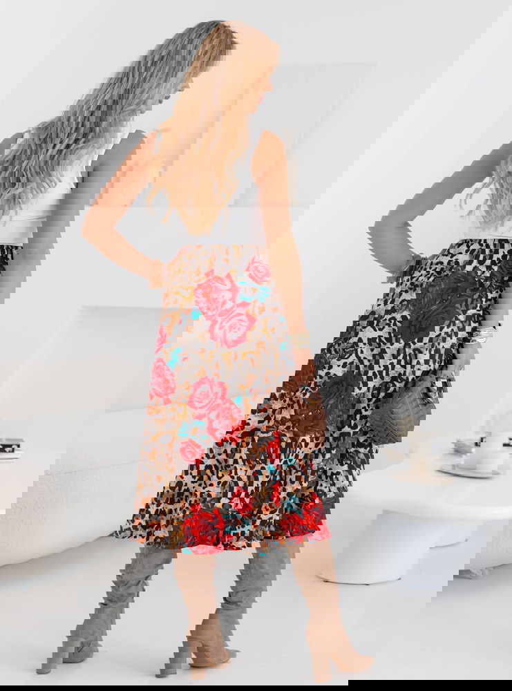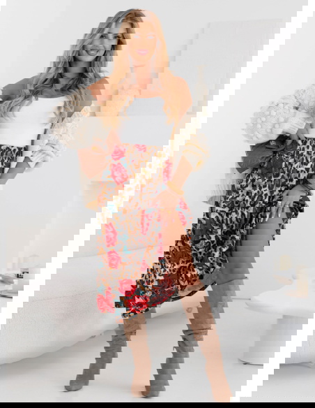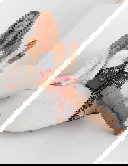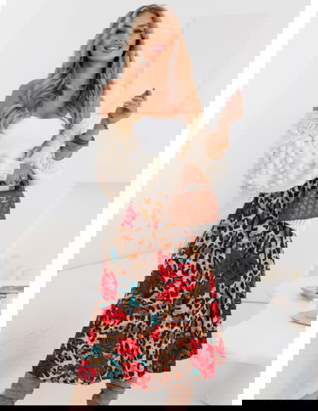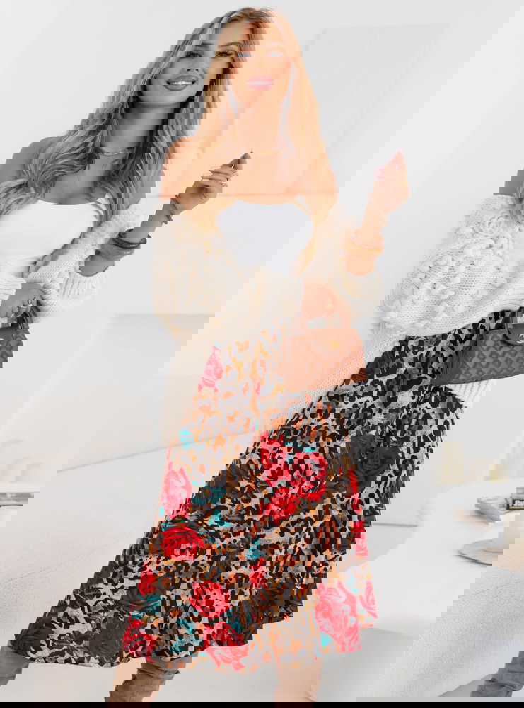 Wzorzysta spódnica midi Kenley - wzór 2 to propozycja, która od razu przyciąga uwagę i dodaje charakteru całej stylizacji. Jej unikalny wzór łączy w sobie motywy panterki i kwiatów, tworząc niepowtarzalne zestawienie. Taki design sprawia, że spódnica staje się głównym elementem każdej stylizacji. To model, który pozwala wyróżnić się w tłumie i podkreślić swój indywidualny styl. Długość midi nadaje jej elegancji i klasy. Luźniejszy krój gwarantuje komfort i swobodę ruchów. Intensywne kolory dodają świeżości i energii, dzięki czemu całość prezentuje się niezwykle efektownie. To spódnica, która doskonale sprawdzi się zarówno w codziennych, jak i bardziej wyjątkowych zestawach. Jej wzorzysta forma to idealny wybór dla osób, które lubią modowe eksperymenty. To propozycja, która łączy w sobie oryginalność z kobiecym urokiem.