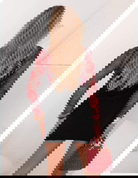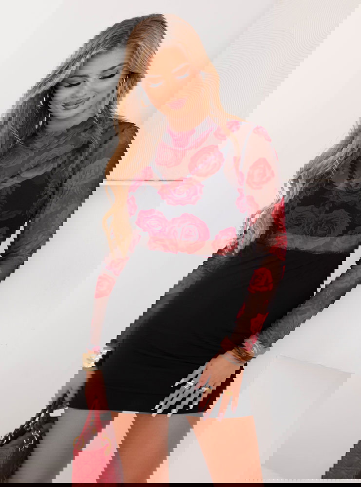 Tiulowa sukienka mini Hereswita - wzór 3 to połączenie kobiecego wdzięku i odrobiny romantycznej zmysłowości. Transparentna góra wykonana z delikatnego tiulu ozdobiona jest intensywnym, czerwonym motywem róż, który pięknie kontrastuje z czarnym tłem. Dzięki temu całość prezentuje się niezwykle efektownie i przyciąga spojrzenia. Długie, tiulowe rękawy dodają lekkości, a jednocześnie idealnie dopełniają całą stylizację. Dopasowana, gładka spódnica mini eksponuje nogi i podkreśla figurę. To sukienka, która pozwala poczuć się wyjątkowo i elegancko w każdej sytuacji. Wzór czerwonych róż sprawia, że model zyskuje charakteru i ponadczasowej klasy. Kobiecy krój łączy w sobie delikatność z odważnym akcentem. To kreacja, która wyróżnia się wśród klasycznych sukienek, jednocześnie pozostając bardzo stylową. Jeśli szukasz stroju, który łączy subtelność tiulu z mocnym, romantycznym akcentem – ta sukienka jest idealnym wyborem.