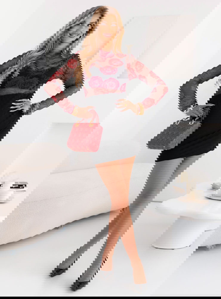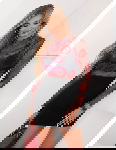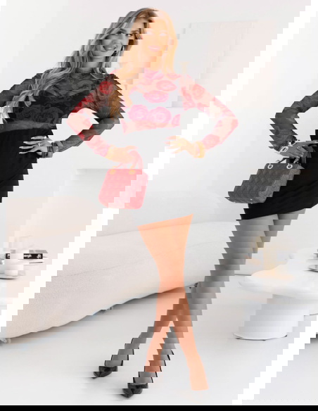 Tiulowa sukienka mini Hereswita - wzór 3 to wyjątkowa propozycja dla kobiet, które lubią wyróżniać się stylowym wyglądem. Czerwone róże na tiulu wprowadzają romantyczny i elegancki klimat. Przezroczysta góra i długie rękawy dodają całości lekkości i subtelnej zmysłowości. Czarna spódnica mini pięknie podkreśla figurę i eksponuje nogi. Sukienka idealnie nadaje się na wyjątkowe okazje, randki czy wieczorne wyjścia. Łączy w sobie kobiecość, odwagę i ponadczasowy wdzięk. To kreacja, która sprawi, że zawsze będziesz w centrum uwagi.