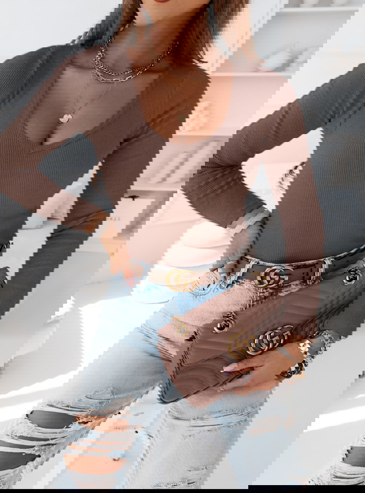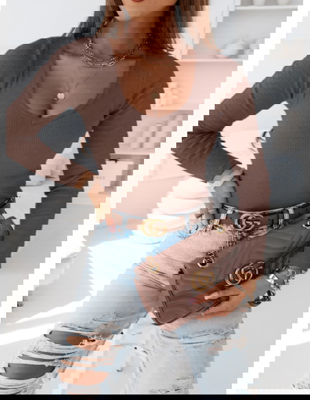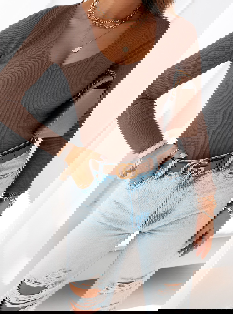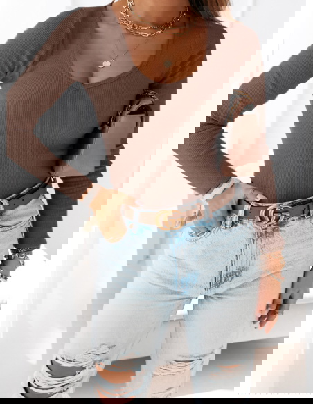 Prążkowana bluzka z dekoltem w serek Teriia - mocha mousse