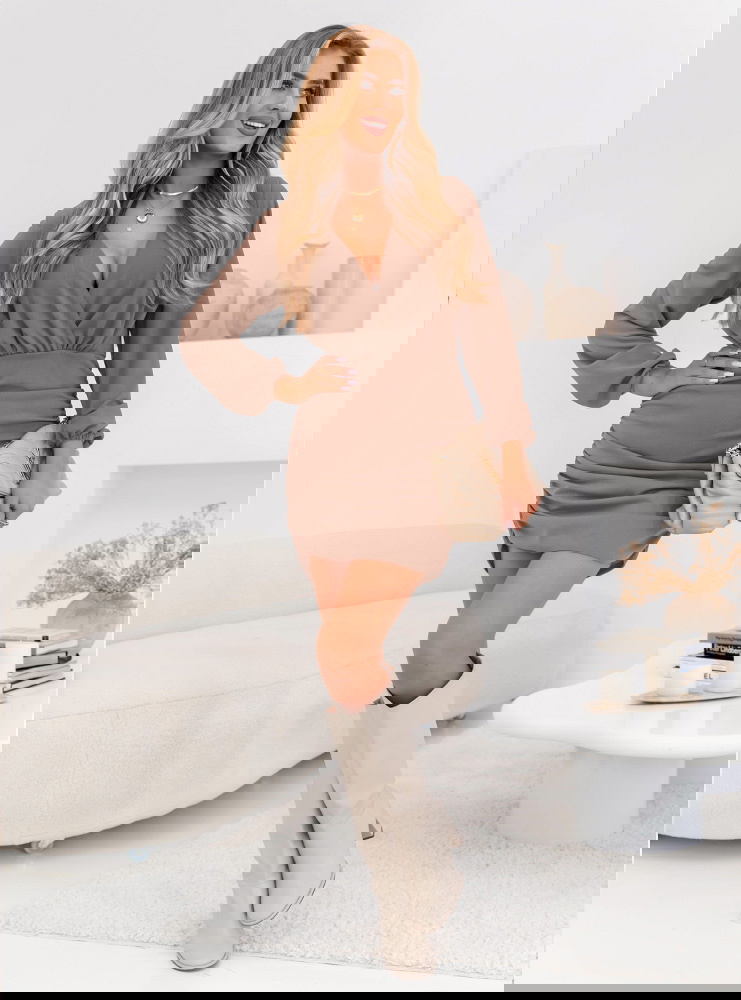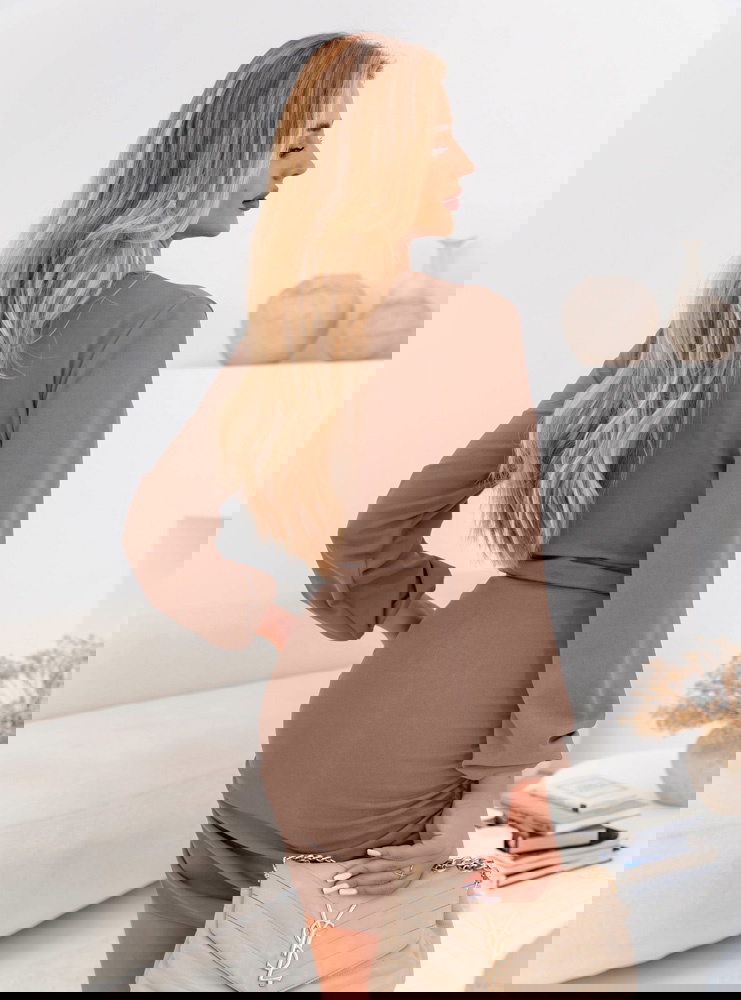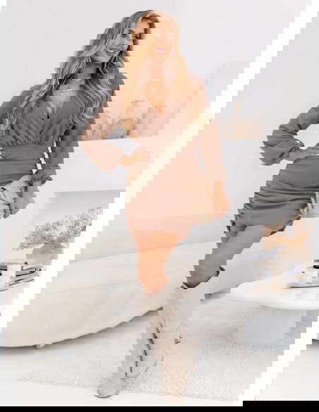 Sukienka mini z przekładanym dekoltem Cerys - mocha mousse to propozycja, która zachwyca elegancją i kobiecym wdziękiem. Jej subtelny kolor mocha mousse idealnie wpisuje się w najnowsze trendy i doskonale podkreśla naturalne piękno. Fason mini pięknie eksponuje nogi, jednocześnie zachowując klasę i szyk. Przekładany dekolt nadaje całości nutę zmysłowości, a długie rękawy równoważą odważny charakter sukienki. To model, który świetnie dopasowuje się do sylwetki i podkreśla jej atuty. Dzięki swojej prostocie i wyrafinowanemu krojowi sprawdzi się zarówno w codziennych, jak i bardziej wyjątkowych stylizacjach. To sukienka, która nie wymaga wielu dodatków, aby wyglądać efektownie. Jej minimalistyczny charakter pozwala na łatwe łączenie z biżuterią i torebkami w różnych stylach. To wybór idealny dla kobiet ceniących modną elegancję z nutą klasyki. W tej sukience poczujesz się wyjątkowo w każdej sytuacji.
