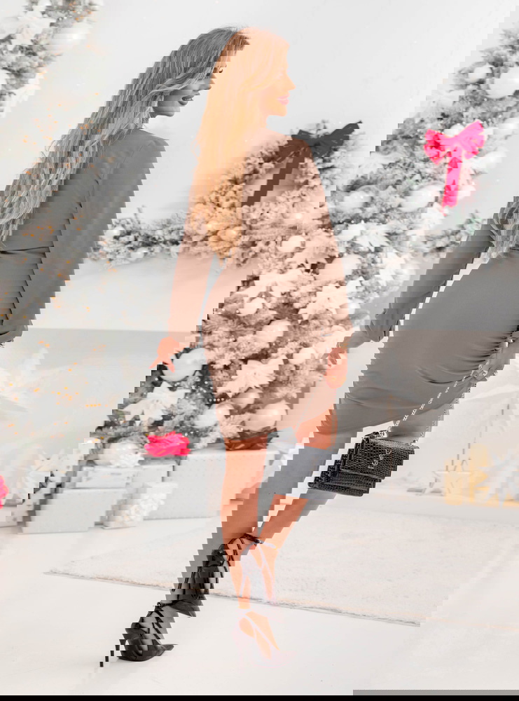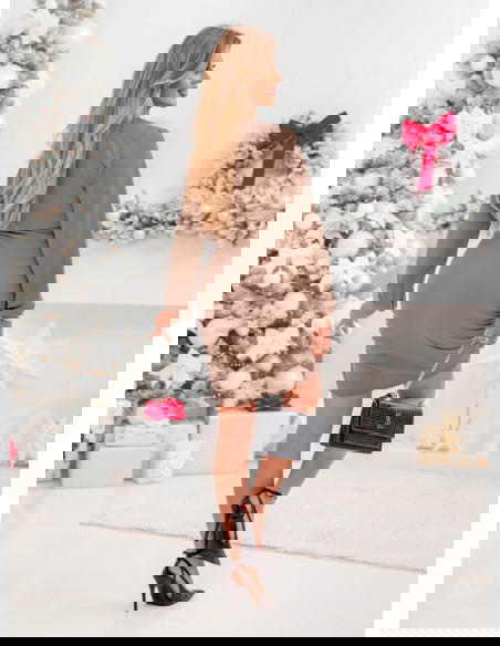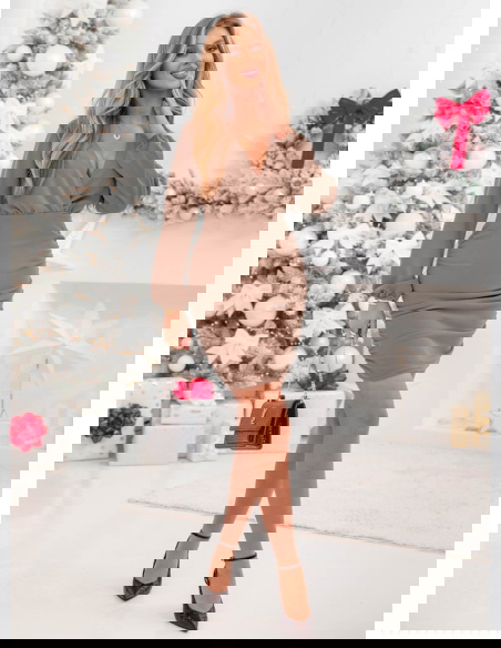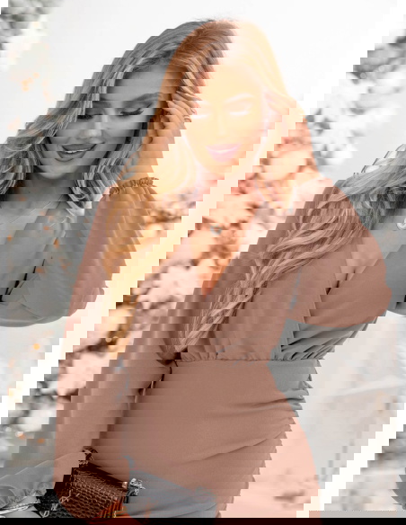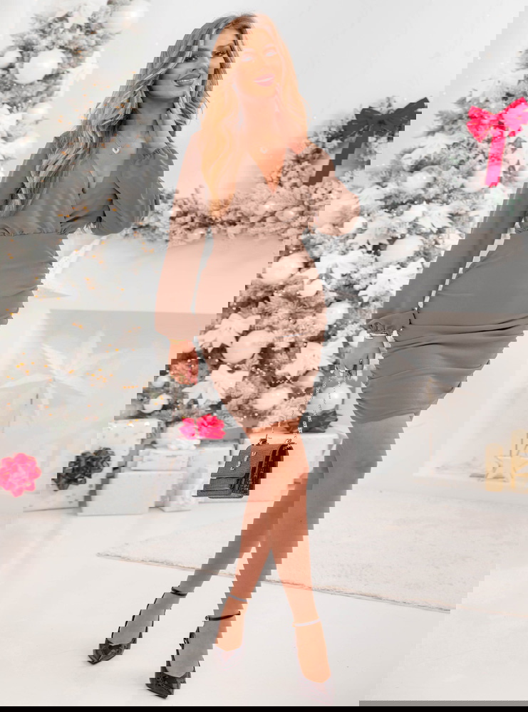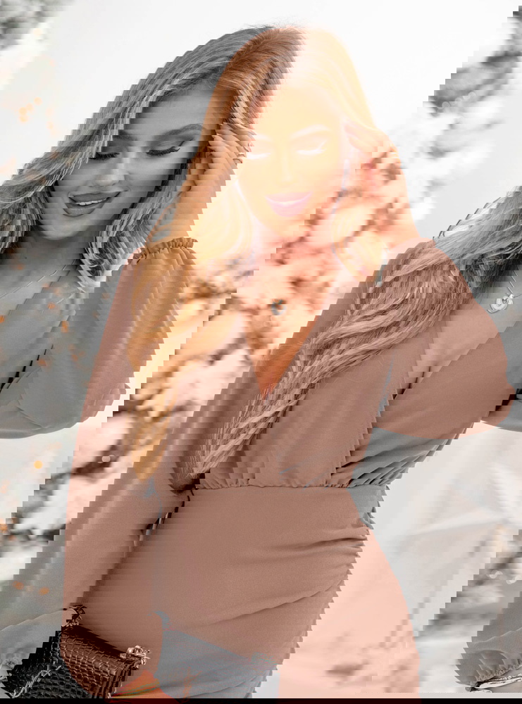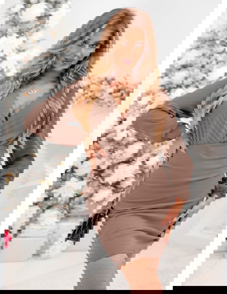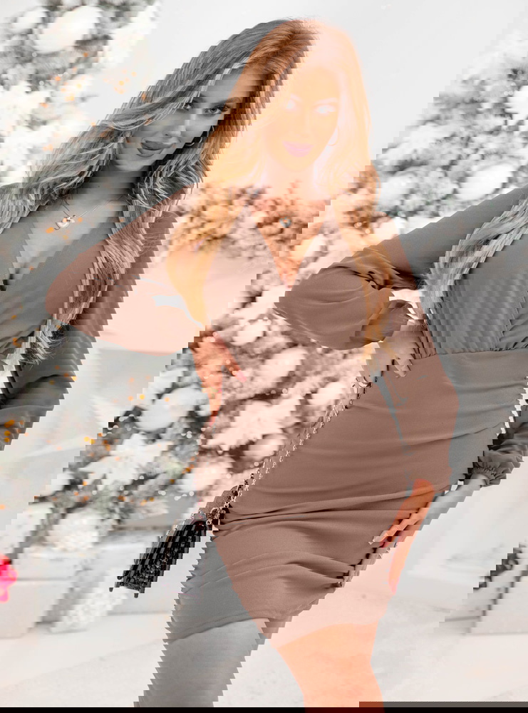 Sukienka mini z przekładanym dekoltem Jereyne - mocha mousse to kwintesencja kobiecości i ponadczasowej elegancji. Jej piękny, stonowany kolor mocha mousse doskonale podkreśla urodę i nadaje całości wyjątkowego charakteru. Fason mini w połączeniu z dopasowanym krojem podkreśla sylwetkę i eksponuje nogi. Przekładany dekolt dodaje sukience zmysłowości, zachowując przy tym klasę i szyk. Długie rękawy tworzą idealny kontrast dla krótkiego dołu, dzięki czemu sukienka prezentuje się harmonijnie. To model, który świetnie sprawdzi się zarówno w codziennych, jak i bardziej eleganckich stylizacjach. Minimalistyczny charakter pozwala łatwo dopasować ją do różnych dodatków. Możesz zestawić ją z delikatną biżuterią dla subtelnego efektu lub z wyrazistymi akcesoriami, by stworzyć stylizację pełną charakteru. To sukienka, która łączy prostotę z wyrafinowanym wdziękiem. W niej poczujesz się wyjątkowo, niezależnie od okazji.