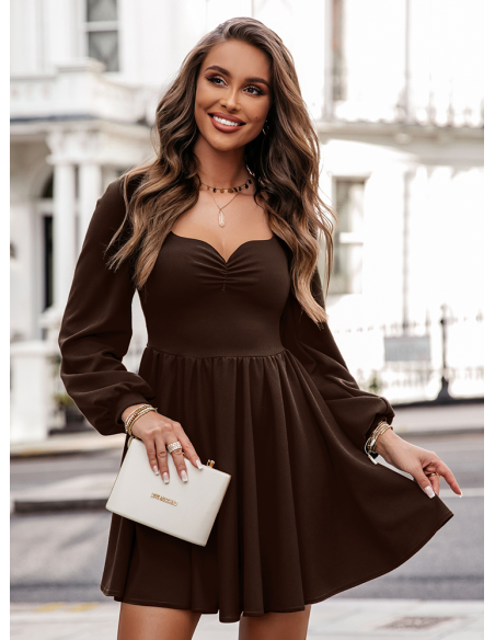Czekoladowa sukienka z marszczeniem na dekolcie Celina to must-have w kobiecej garderobie. Jej krój podkreśla sylwetkę i dodaje lekkości każdemu ruchowi. Dekolt z marszczeniem to subtelny, ale efektowny detal. Rozkloszowany dół i długie rękawy tworzą harmonijną całość. To sukienka, którą łatwo wystylizujesz na wiele okazji. Jej klasyczny odcień czekolady pasuje do różnych dodatków i nigdy nie wychodzi z mody. To idealna propozycja dla kobiet, które cenią sobie elegancję połączoną z wygodą.