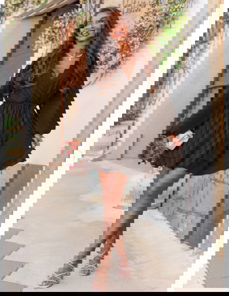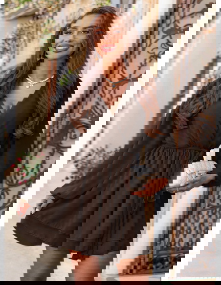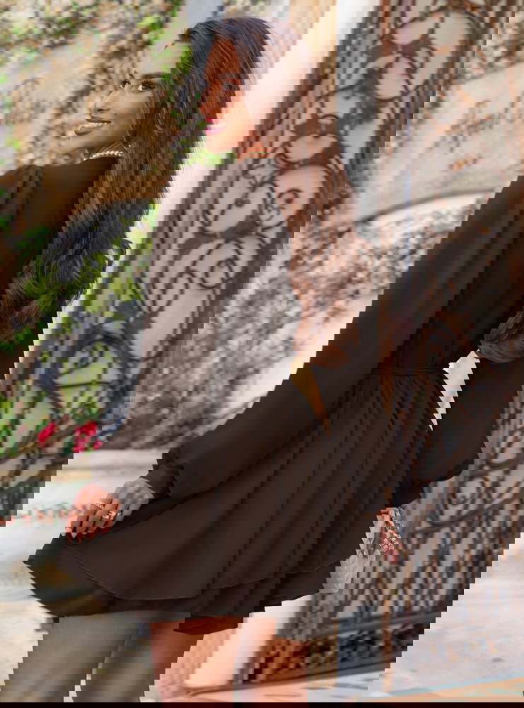 Czekoladowa szyfonowa sukienka mini z przekładanym dekoltem Aspasia to propozycja, która łączy kobiecość i lekkość w jednym fasonie. Jej zwiewny krój sprawia, że każda stylizacja nabiera subtelnego charakteru. Przekładany dekolt pięknie podkreśla linię biustu, dodając całości nuty zmysłowości. Długie, luźne rękawy nadają sukience elegancji i delikatności. Pasek w talii podkreśla sylwetkę, a długość mini eksponuje nogi. Warstwowy dół sprawia, że całość wygląda lekko i dziewczęco. To sukienka, która idealnie łączy nowoczesny styl z klasyczną elegancją. Głęboki czekoladowy odcień dodaje jej wyjątkowego uroku. To model, w którym każda kobieta poczuje się pewnie i stylowo. Sukienka przyciąga spojrzenia, ale jednocześnie jest bardzo subtelna i uniwersalna.