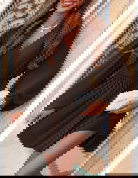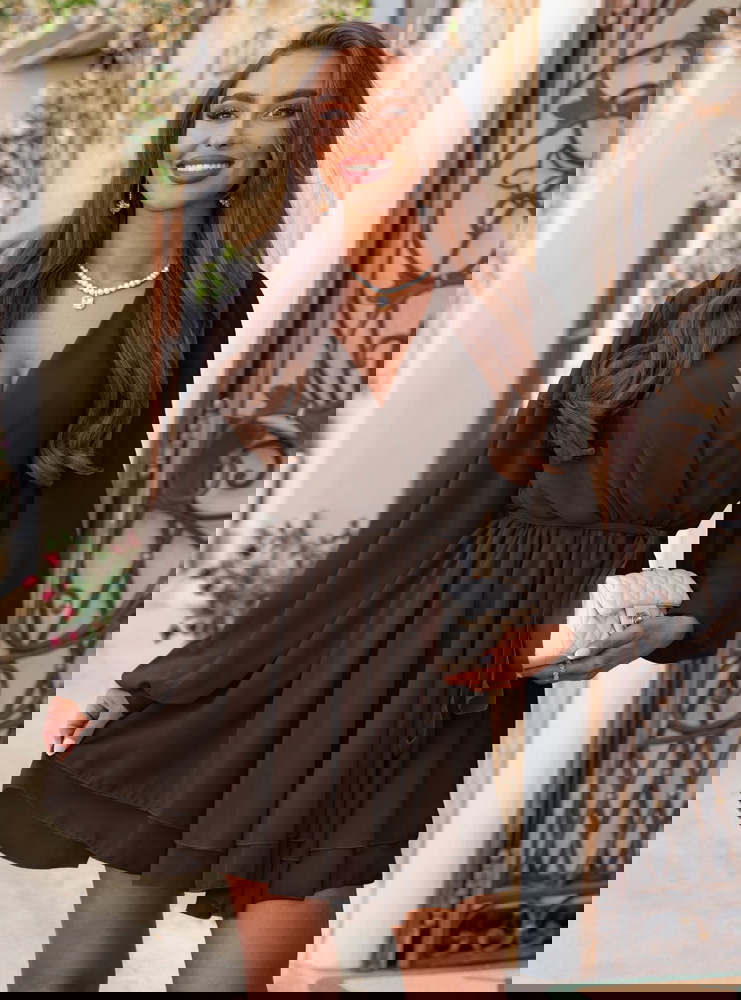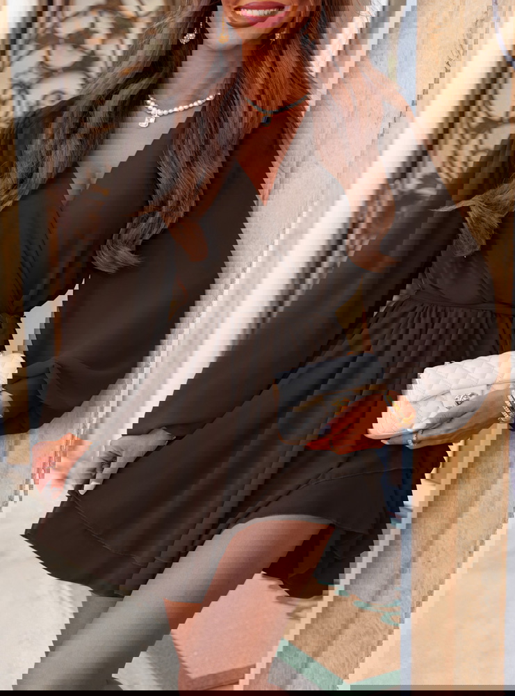 Czekoladowa szyfonowa sukienka mini z przekładanym dekoltem Aspasia