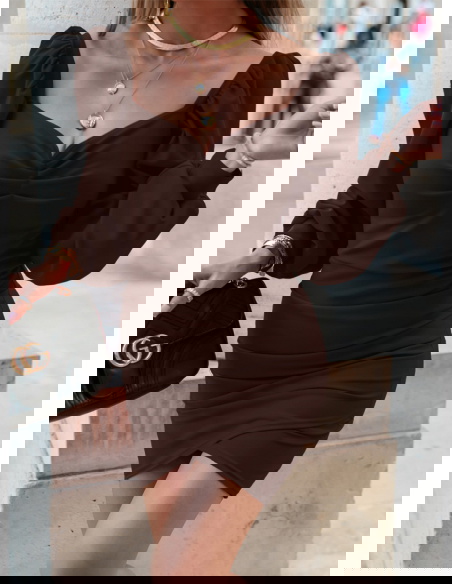 Czekoladowa sukienka z dekoltem w serce i marszczeniem z boku Neriioo