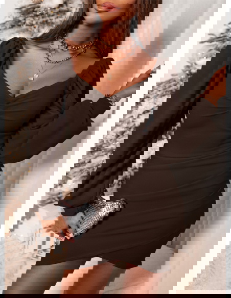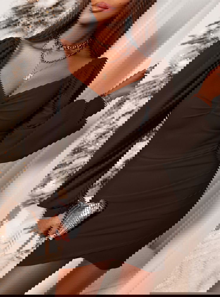 Czekoladowa sukienka z dekoltem w serce i marszczeniem z boku Bereliaa