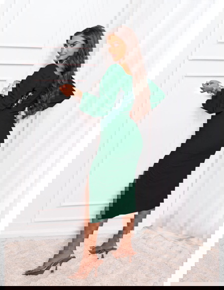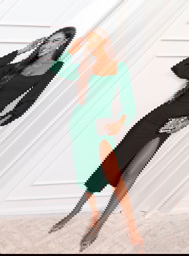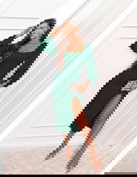 Sukienka z rozcięciem Pamalyn - butelkowa zieleń to kwintesencja elegancji i szyku w nowoczesnym wydaniu. Jej głęboki odcień zieleni sprawia, że każda stylizacja nabiera luksusowego charakteru. Ten kolor od lat kojarzony jest z klasą i ponadczasową modą, dzięki czemu świetnie pasuje na wiele okazji. Fason midi subtelnie wydłuża sylwetkę i podkreśla jej proporcje. Dekolt w prostokątnym kształcie pięknie eksponuje ramiona i szyję, dodając lekkości całej stylizacji. Bufiaste rękawy wprowadzają nutę romantycznego wdzięku. Rozcięcie na nodze dodaje zmysłowości i przełamuje klasyczny krój, sprawiając, że całość prezentuje się wyjątkowo. Sukienka zachwyca prostotą, a jednocześnie przyciąga spojrzenia detalami, które nadają jej niepowtarzalnego uroku. To model, który świetnie sprawdzi się zarówno podczas oficjalnych uroczystości, jak i wieczornych spotkań. W tej sukience każda kobieta poczuje się pięknie i pewnie.