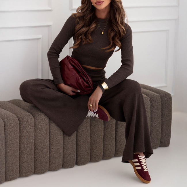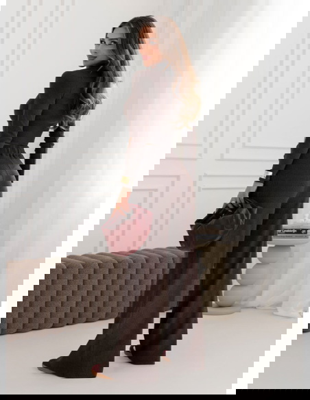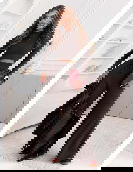 Czekoladowy prążkowany komplet bluzka + spodnie Shaina