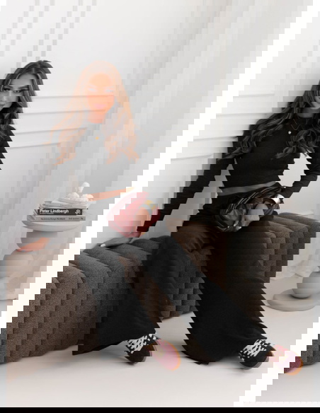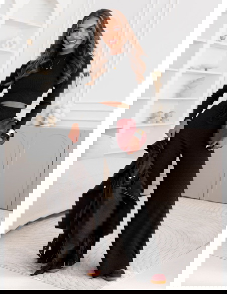 Czarny prążkowany komplet bluzka + spodnie Shaina to świetny wybór na spotkania ze znajomymi, kiedy chcesz wyglądać modnie i czuć się swobodnie. Doskonale sprawdzi się również w pracy, jeśli połączysz go z marynarką czy klasycznym płaszczem.