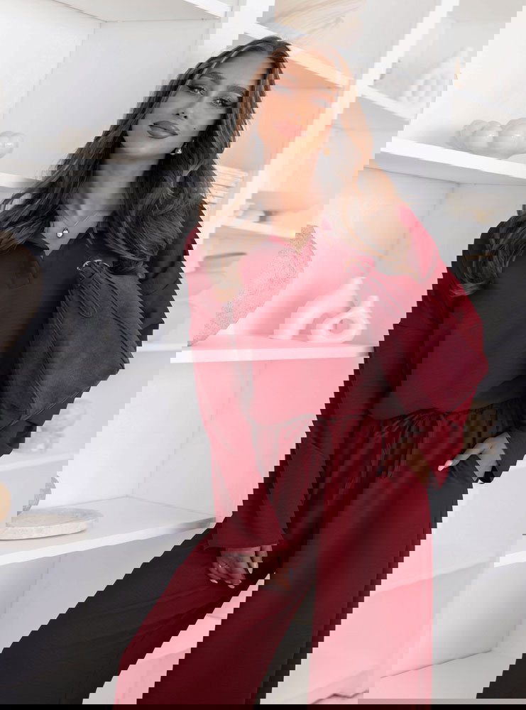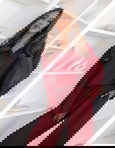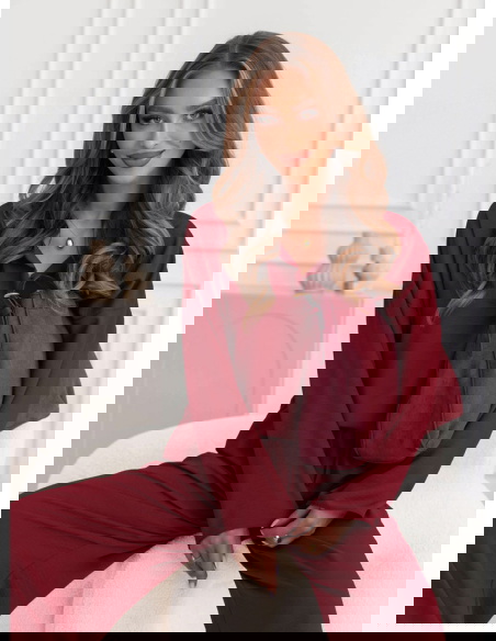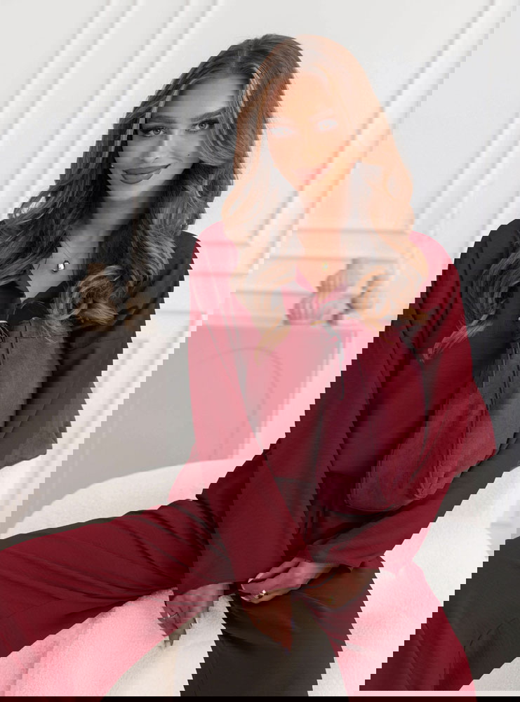 Bordowy komplet bluzka i szerokie spodnie Fennell to propozycja, która zachwyca elegancją i prostotą w najlepszym wydaniu. Już na pierwszy rzut oka widać, że to zestaw, który wyróżnia się ponadczasowym charakterem. Głęboki odcień bordo dodaje mu klasy i wyjątkowego uroku, dzięki czemu świetnie wpisuje się w aktualne trendy. To komplet, który łączy wygodę z modnym wyglądem, sprawiając, że każda stylizacja nabiera nowego wymiaru. W nim poczujesz się kobieco, a zarazem swobodnie, bez względu na okazję. Bluzka o luźnym kroju subtelnie opada na sylwetkę, a szerokie spodnie dodają całości lekkości i elegancji. Ten zestaw pozwoli Ci w prosty sposób wyglądać stylowo i z klasą. Bordo to kolor, który pięknie podkreśla urodę i dodaje pewności siebie. To wybór idealny dla kobiet ceniących nowoczesne podejście do klasyki. Każdy element zestawu współgra ze sobą, tworząc harmonijną i efektowną całość.